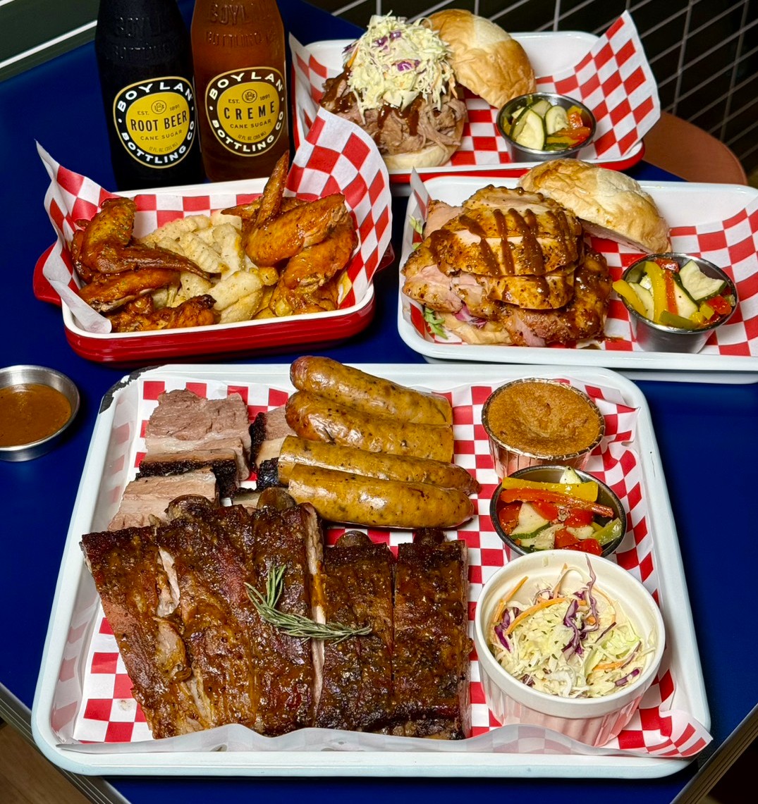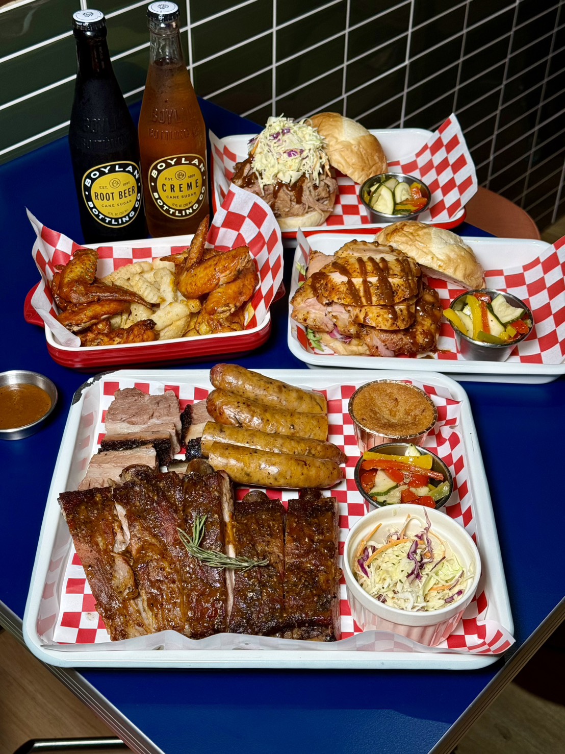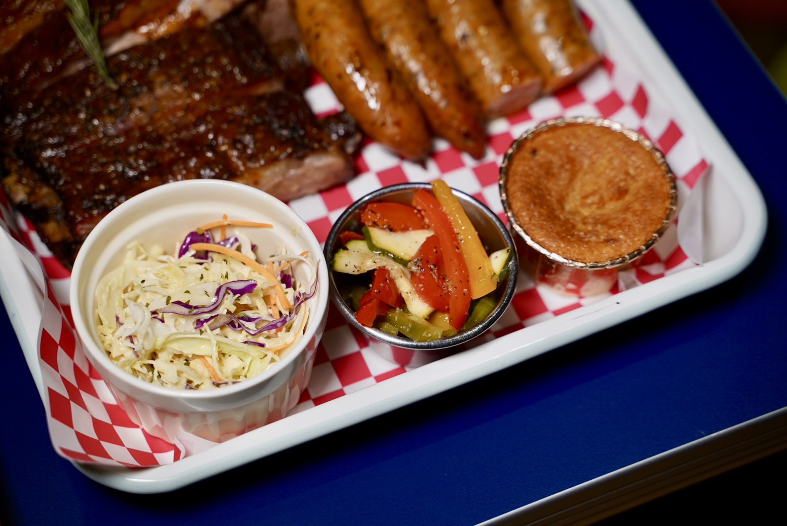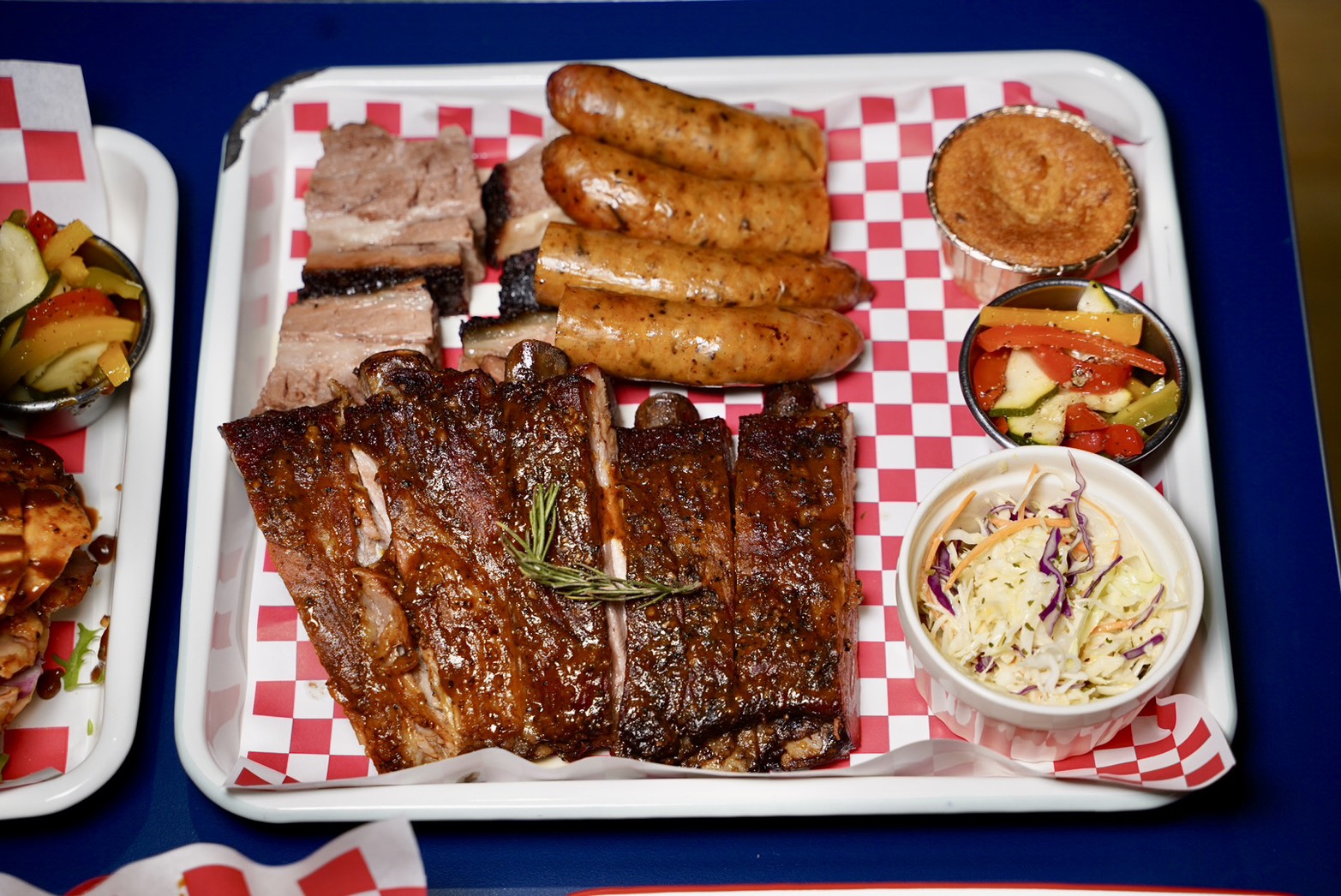 超浮誇的「雙人超爽煙燻烤盤」一上桌就是全場焦點!一大盤包含豬肋排、牛前胸以及美式香腸,一次滿足店內所有招牌烤肉,還會附上解膩的涼拌菜、醃菜以及玉米布丁,飽足感超夠!