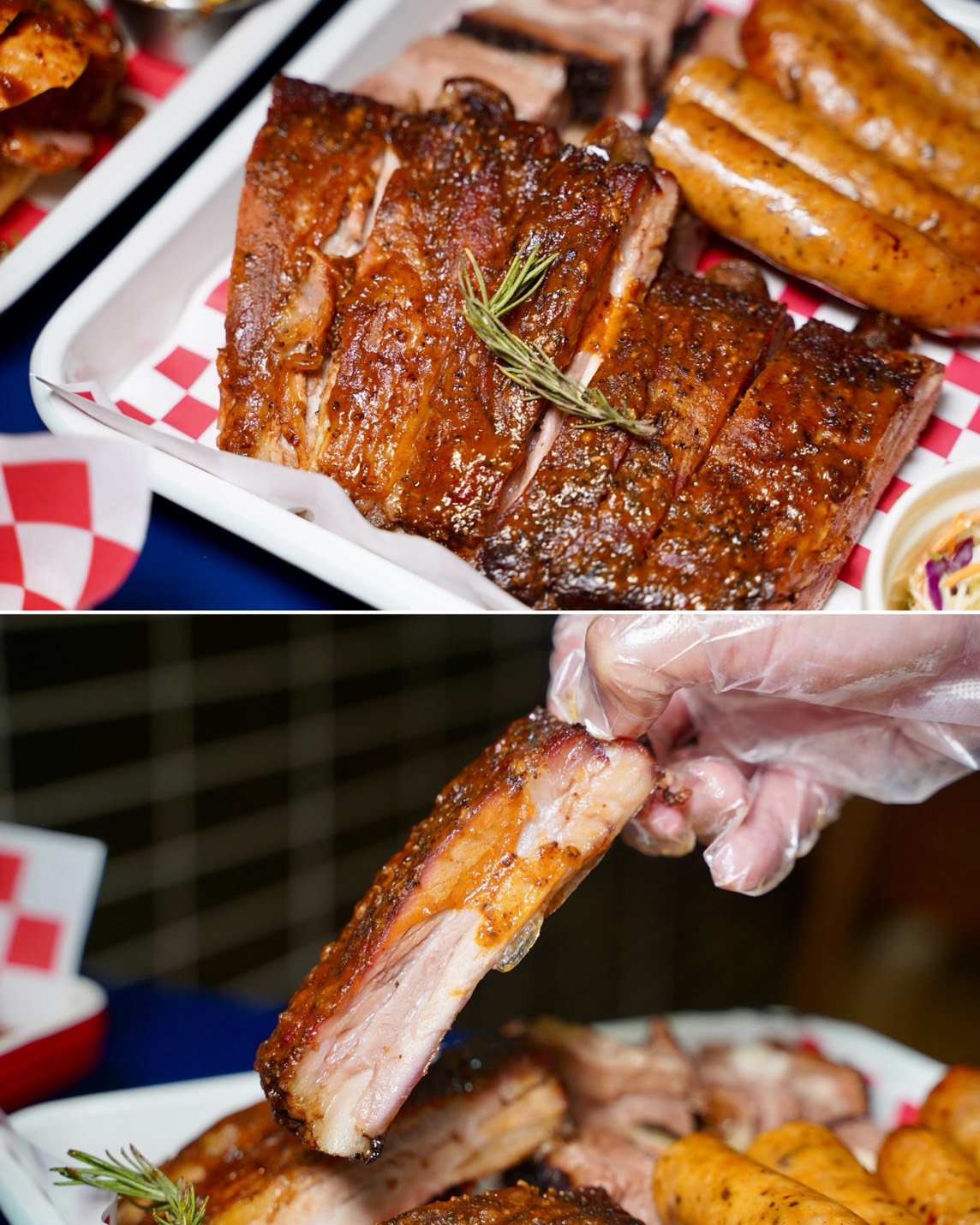 「煙燻慢烤豬肋排」不誇張,輕輕一咬就骨肉分離!使用23種香料,加上台灣龍眼木煙燻8小時,每一口真的都是又香又嫩,尤其帶點膠質感的骨邊肉,真的超厲害~