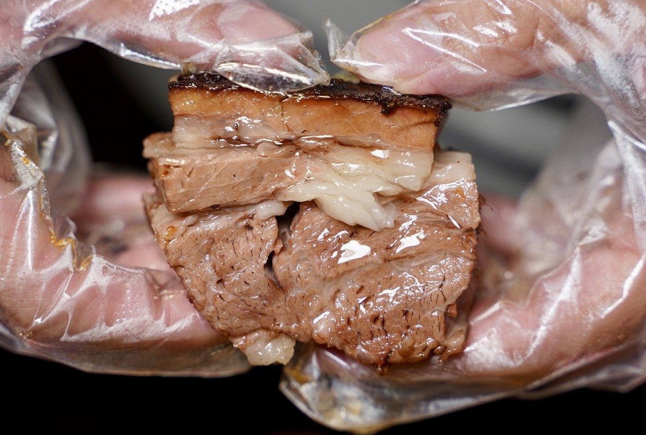懂吃的都知道,德州烤肉的靈魂就是這個「牛胸肉」,這才是考驗廚師真本事的部位!拿起來整塊Q彈軟嫩,超像控肉,而且汁水狂流,放進嘴裡直接化開,這真的太銷魂好吃了!