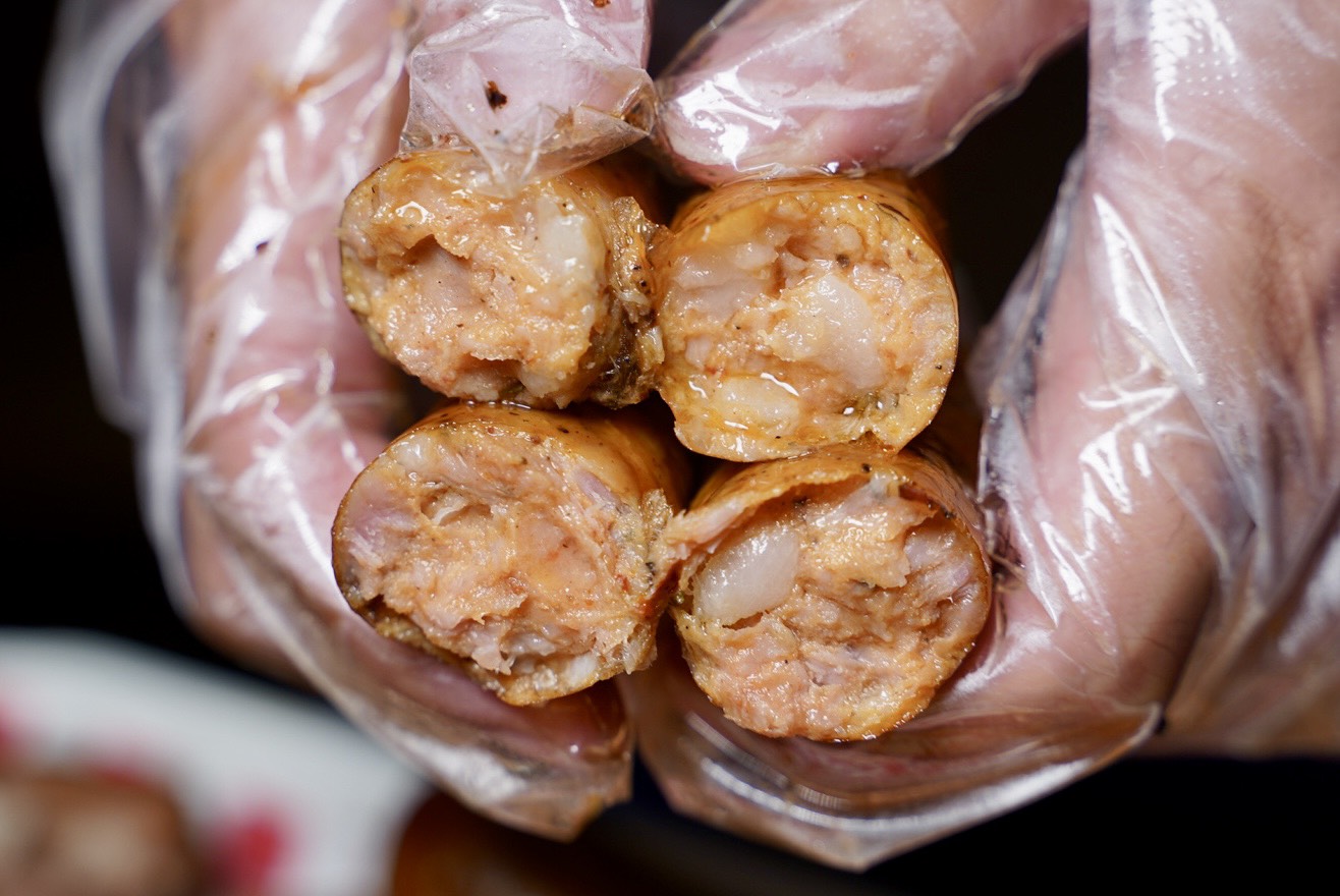 「美式香腸」外觀看起來像熱狗,但吃起來完全不一樣,外皮咬下去很脆口,接著是滿滿肉香混合著辛香料,調味不會太重,沾BBQ醬很對味。