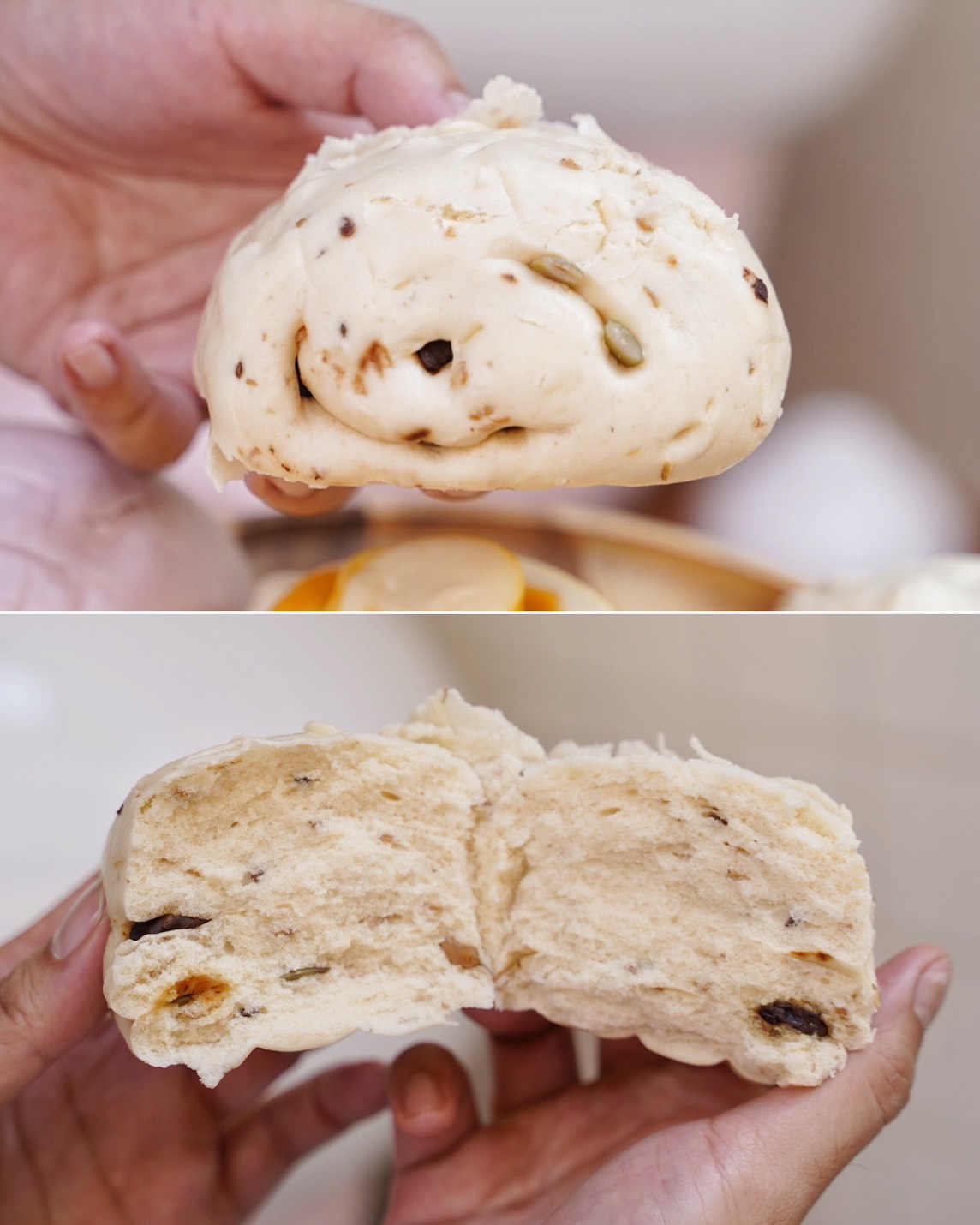 「多穀物堅果核桃饅頭」以黑糖饅頭為基底,同時吃得到堅果、果乾,不只是澱粉,還能吃到健康的油脂,是長輩絕對會喜歡的口味。