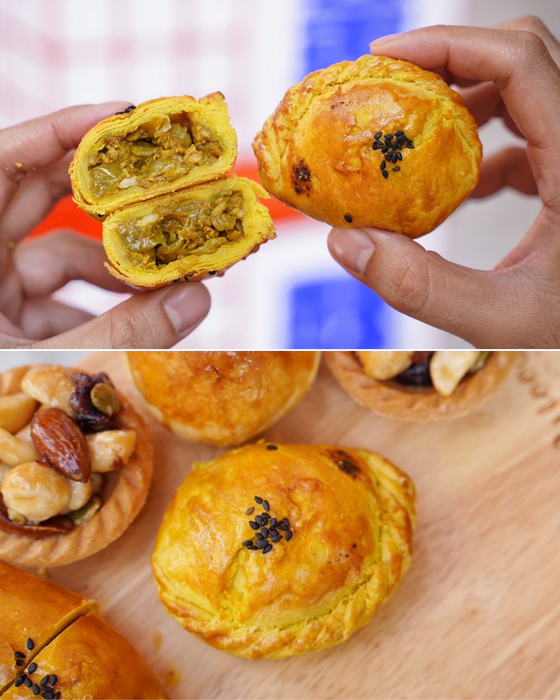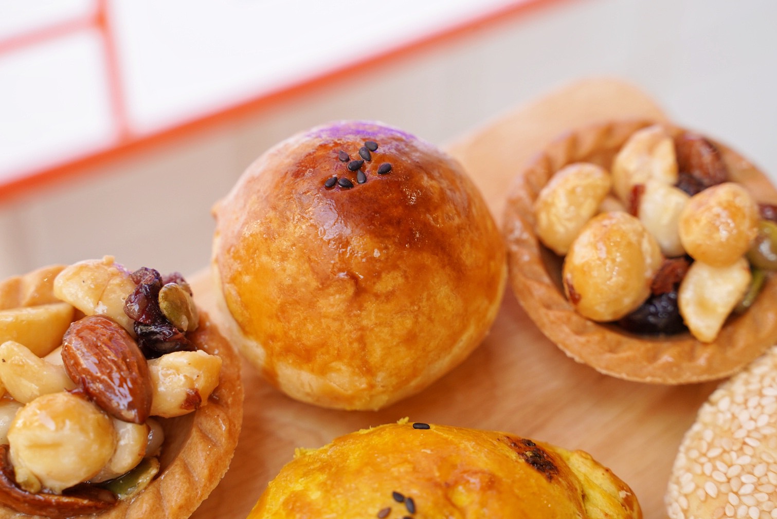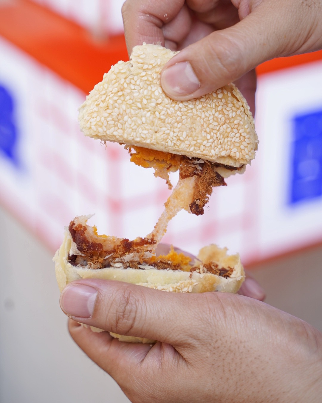 「三Q餅」酥脆的芝麻餅皮,咬下去是肉鬆、烏豆沙、鹹蛋黃以及麻糬內餡,鹹鹹甜甜的非常涮嘴。