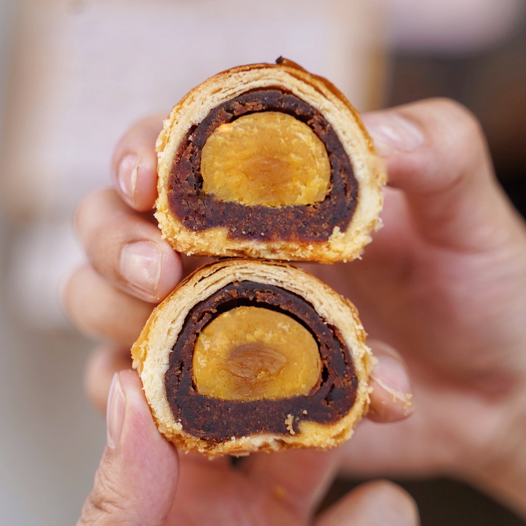 超強「經典蛋黃酥」也是必買!每到中秋節真的一盒難求,去年還獲得十大蛋黃酥名店,蛋黃酥外皮酥脆且不油膩,豆沙餡甜度大概半糖左右,吃起來完全不膩口,加上泡過高粱酒的鹹蛋黃,鹹香濃郁又不腥,這真的是我近幾年吃過最好吃的蛋黃酥之一,說它是嘉義最好吃蛋黃酥我絕對也雙舉高手同意!