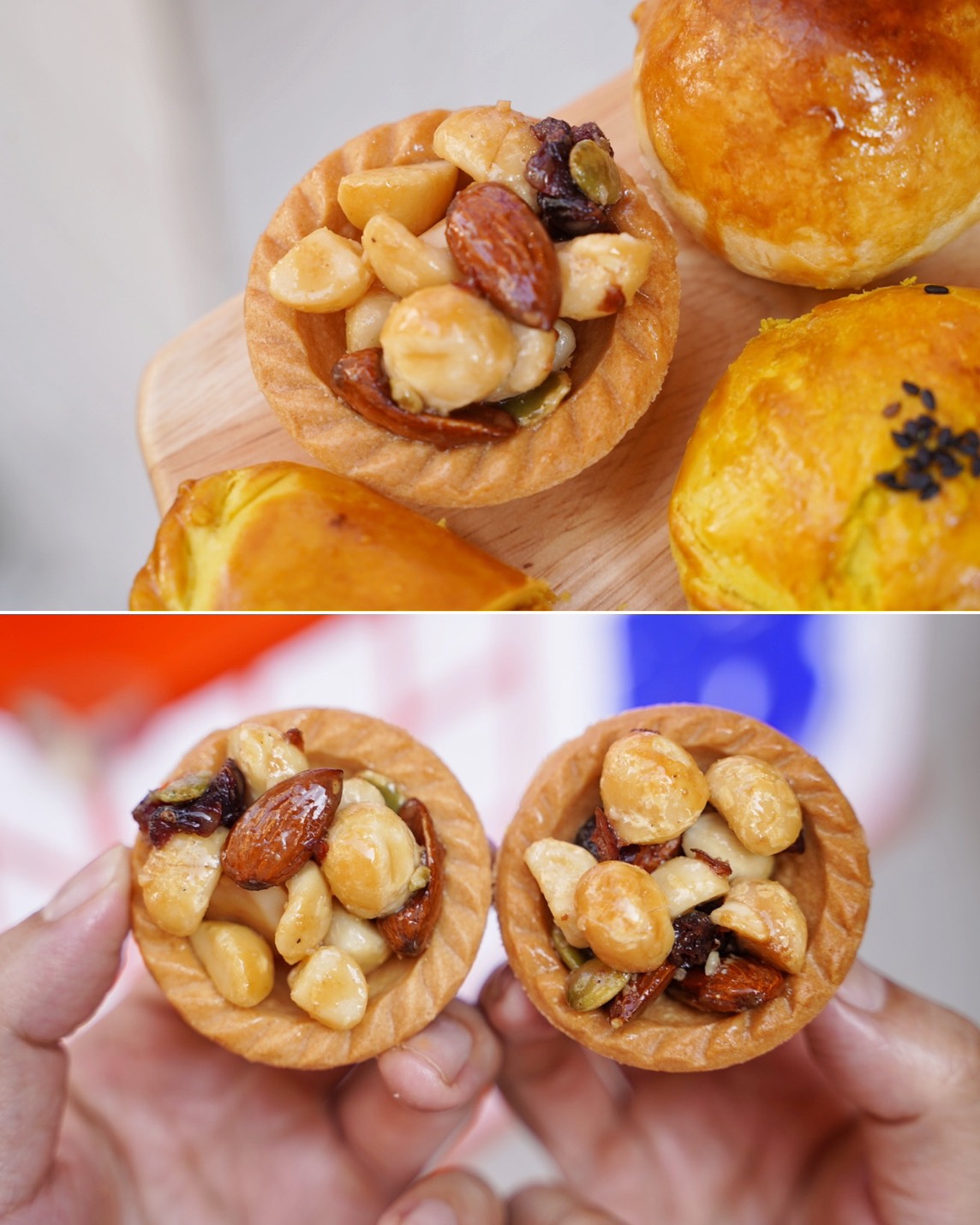 「綜合夏威夷豆塔」堅果真的給好給滿,夏威夷豆、杏仁滿到快炸出來,底層的塔皮非常酥脆又不會硬硬的,最驚喜的是一咬下去就自帶蜂蜜香氣,整顆吃完甜而不膩,完全是實力派夏威夷豆塔!