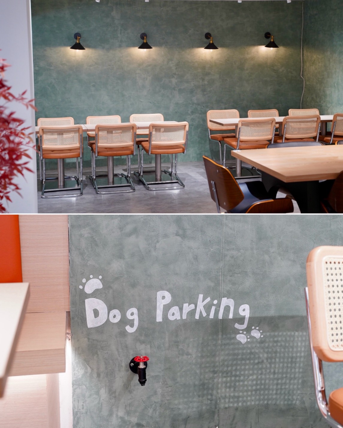 竟然還有設計狗狗綁繩「Dog Parking」區域,不影響其他人用餐之下,讓毛小孩也能一起用餐,真的也很貼心。除了送餐之外,其他都要自己來~像是餐具、水、調味料、衛生紙和置物籃都放在自助區,用完餐也要自助回收,所以才不收取服務費唷!