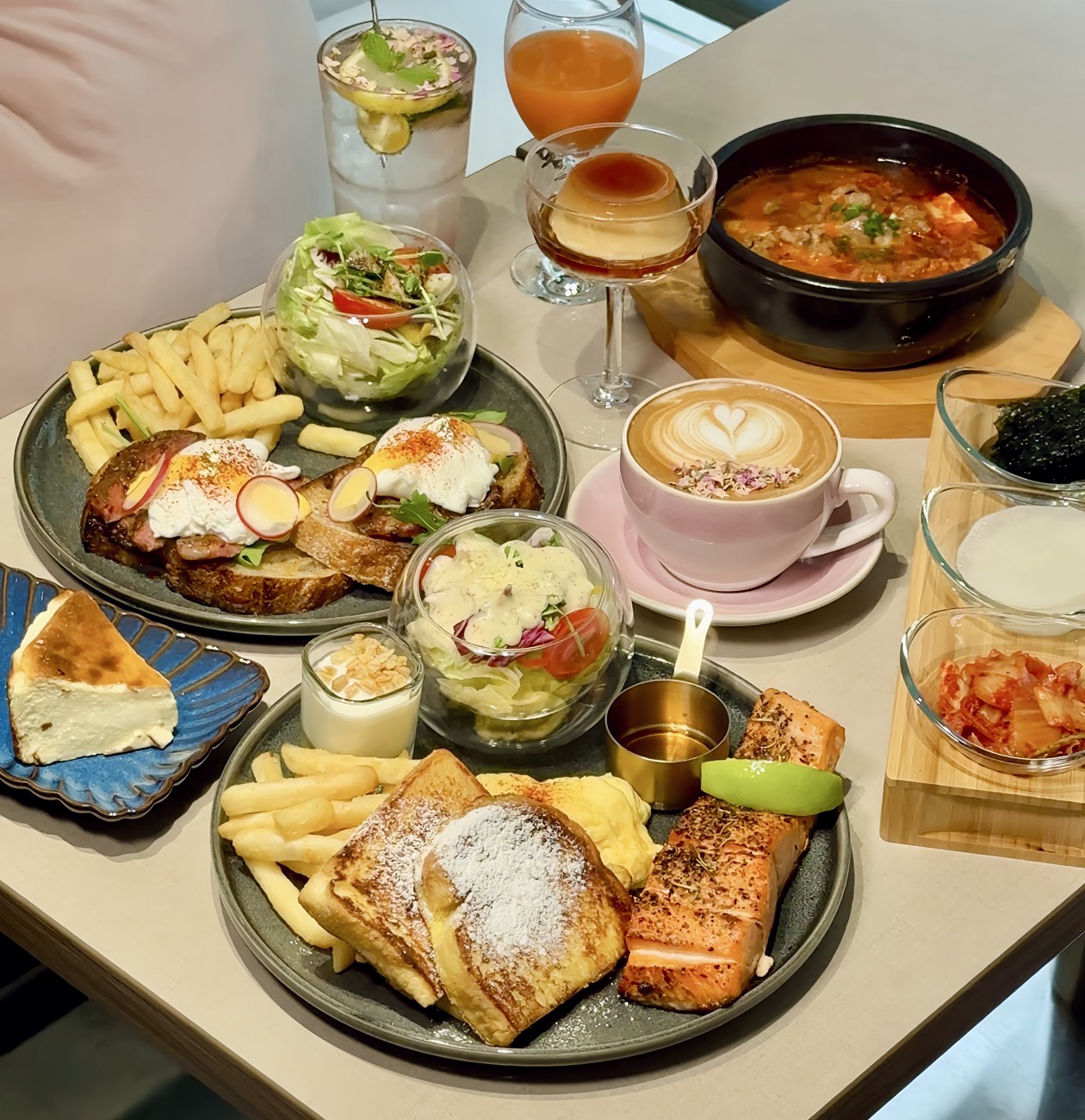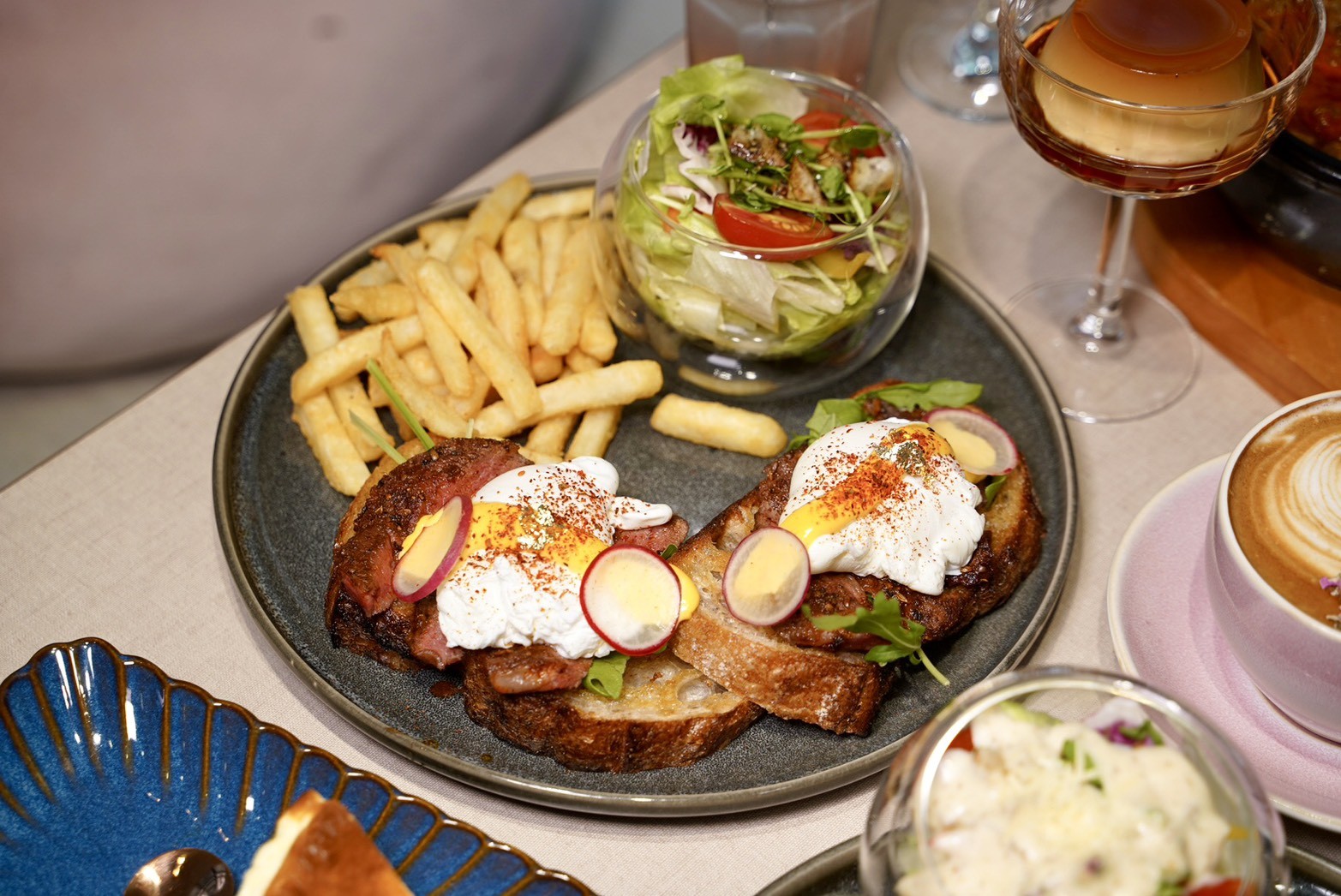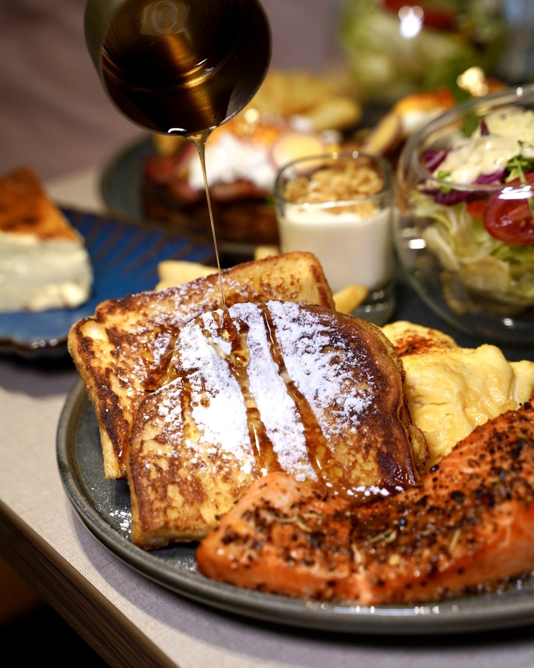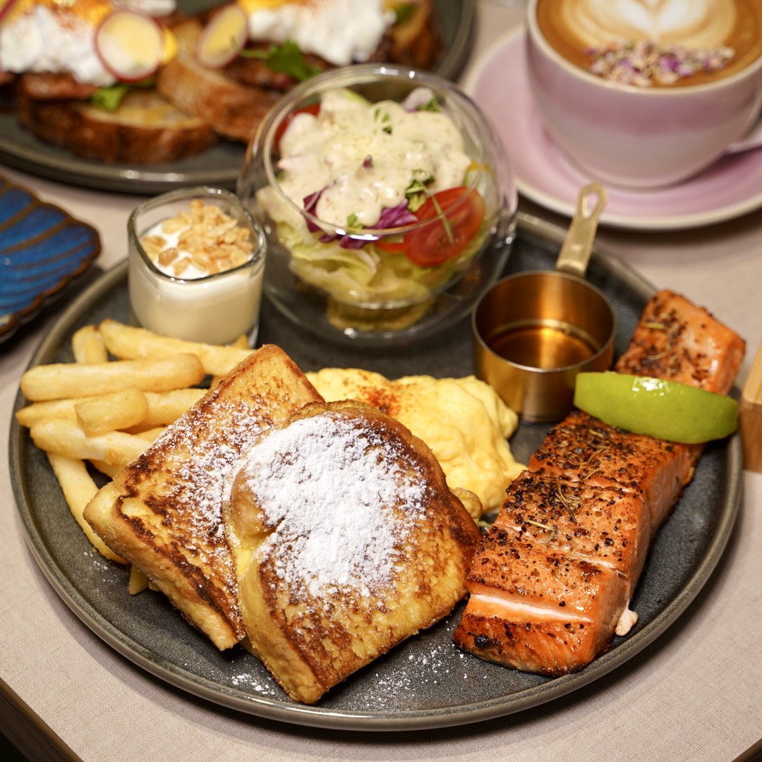 「Tokyo香檸迷迭香鮭魚排菲力早午餐」份量也超澎派,主角鮭魚排厚實又肥美,外皮煎至金黃酥香,裡頭依然保持鮮嫩多汁,擠上一點檸檬更能提出清爽香氣。餐盤上還有楓糖法式吐司、嫩蛋、希臘優格、脆薯與新鮮生菜沙拉,甜鹹交錯,豐富又滿足!