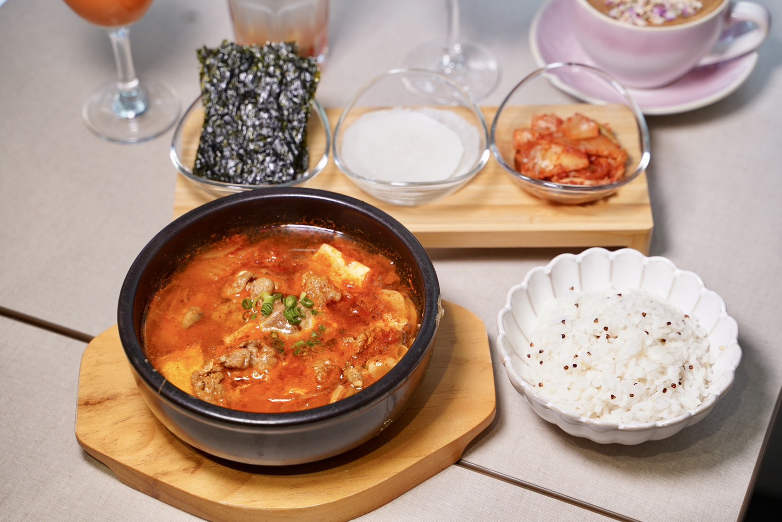 沒想到早午餐店,竟然點得到「泡菜雪花牛嫩豆腐鍋」,還附三款小菜、藜麥飯,豆腐鍋配料頗豐盛,豆腐、牛肉片、香菇、雞蛋等等,吃起來酸辣適中且不會過鹹,意外蠻好吃的耶!