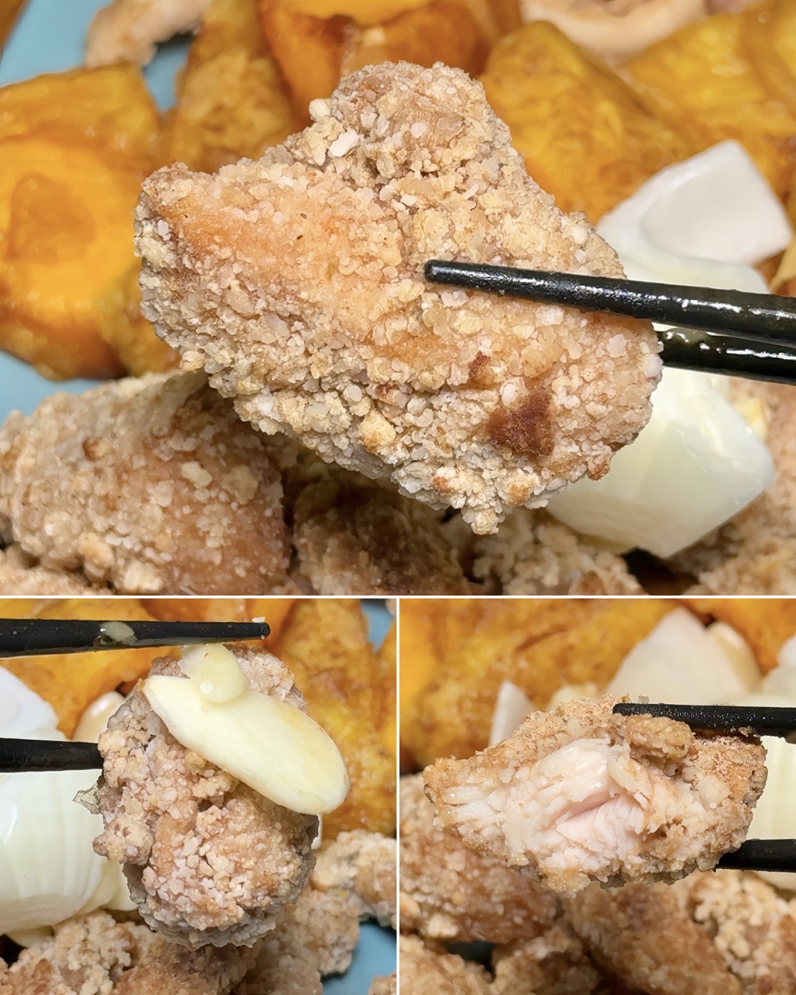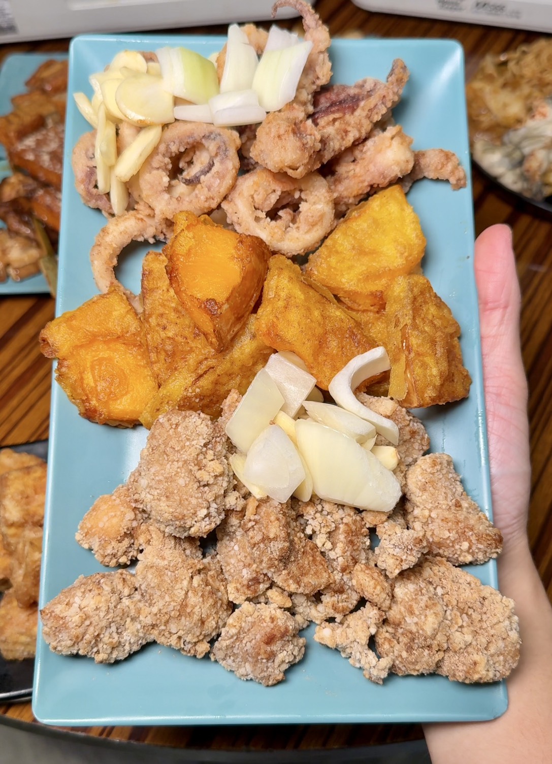 竟然還點得到炸的「南瓜」,咬下去先是脆,接著甜味直接爆出來,比地瓜還多一點水感。炸魷魚也很新鮮,口感彈牙有嚼勁,搭配爆香的蒜頭跟洋蔥,整個香氣層次豐富到不行!