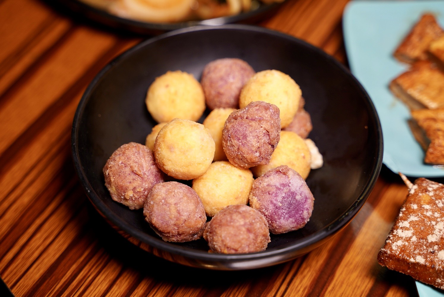 「雙色地瓜球」裡頭還藏著香甜的內餡,炸得外酥內Q不過硬,而且乾爽不油膩。