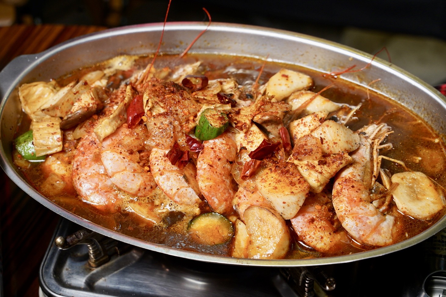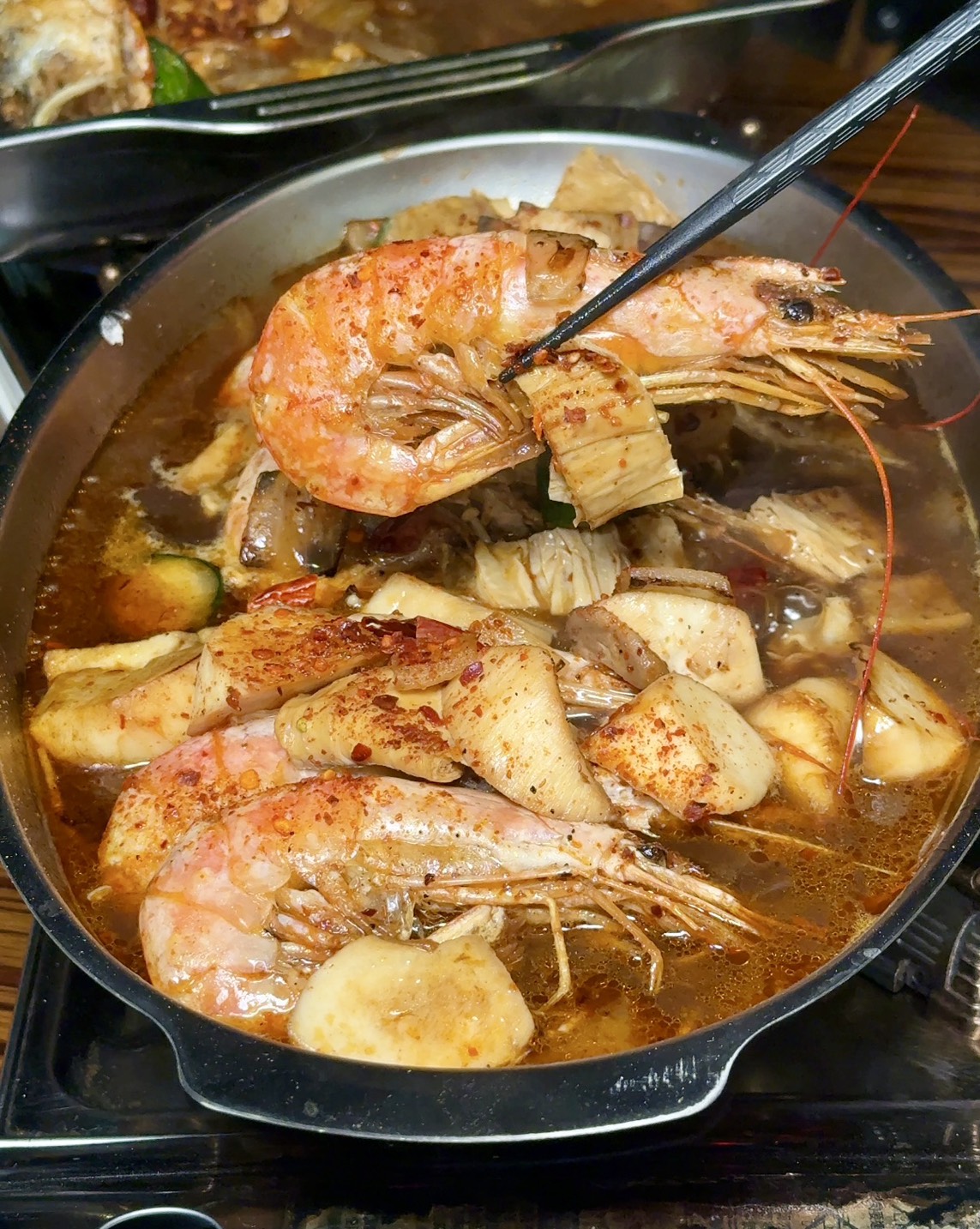 「香辣大蝦」也超澎派的!一整排天使紅蝦直接鋪滿整盤,光看就覺得誘人到不行!蝦子新鮮到爆表,肉質彈牙又紮實,一剝開就是滿滿蝦肉,完全沒有腥味。雖然叫香辣大蝦,但辣度其實蠻溫和的,不會辣到受不了,反而是那個中藥香氣特別突出,喝起來有種溫潤的感覺。