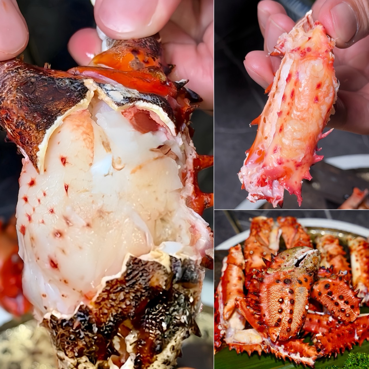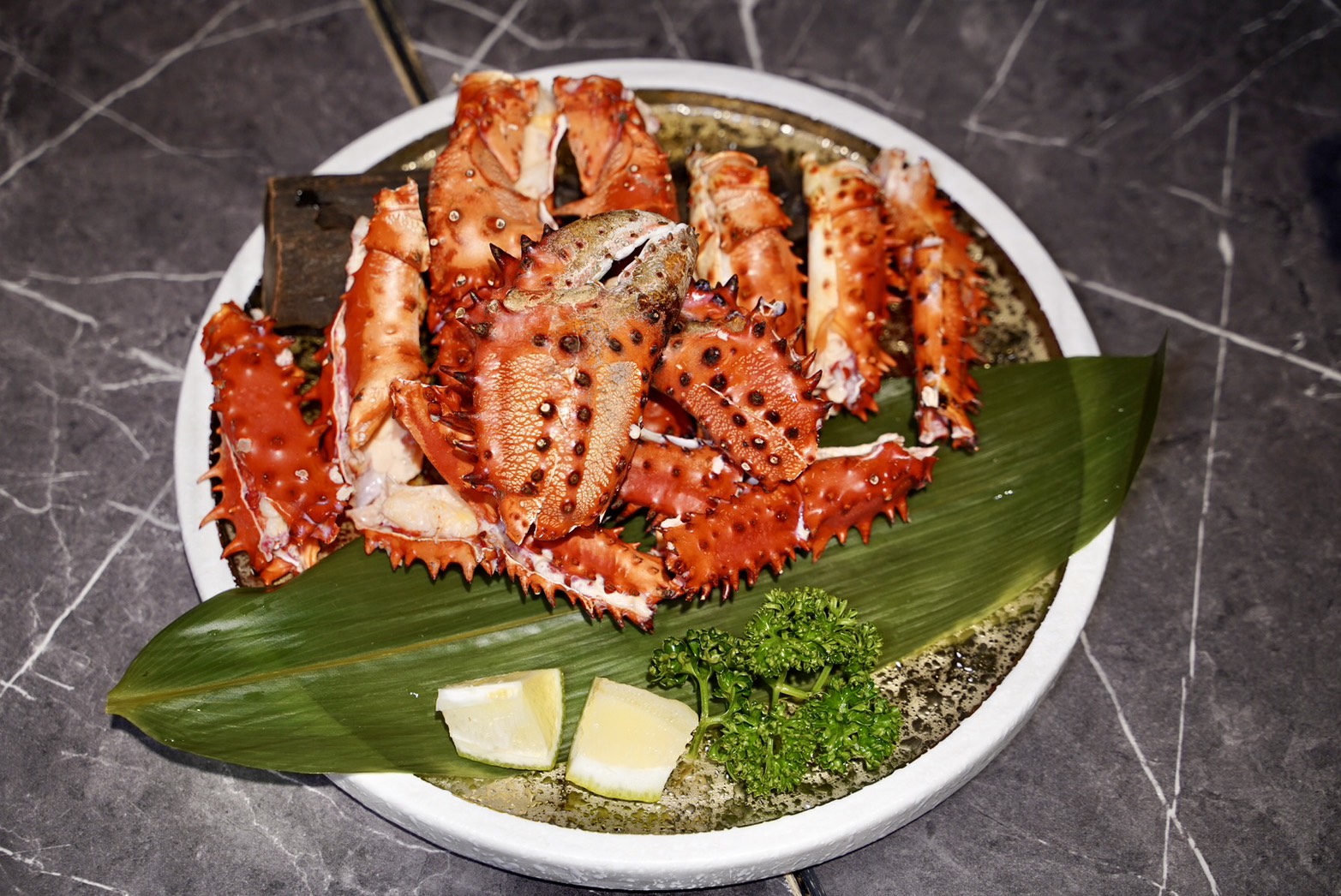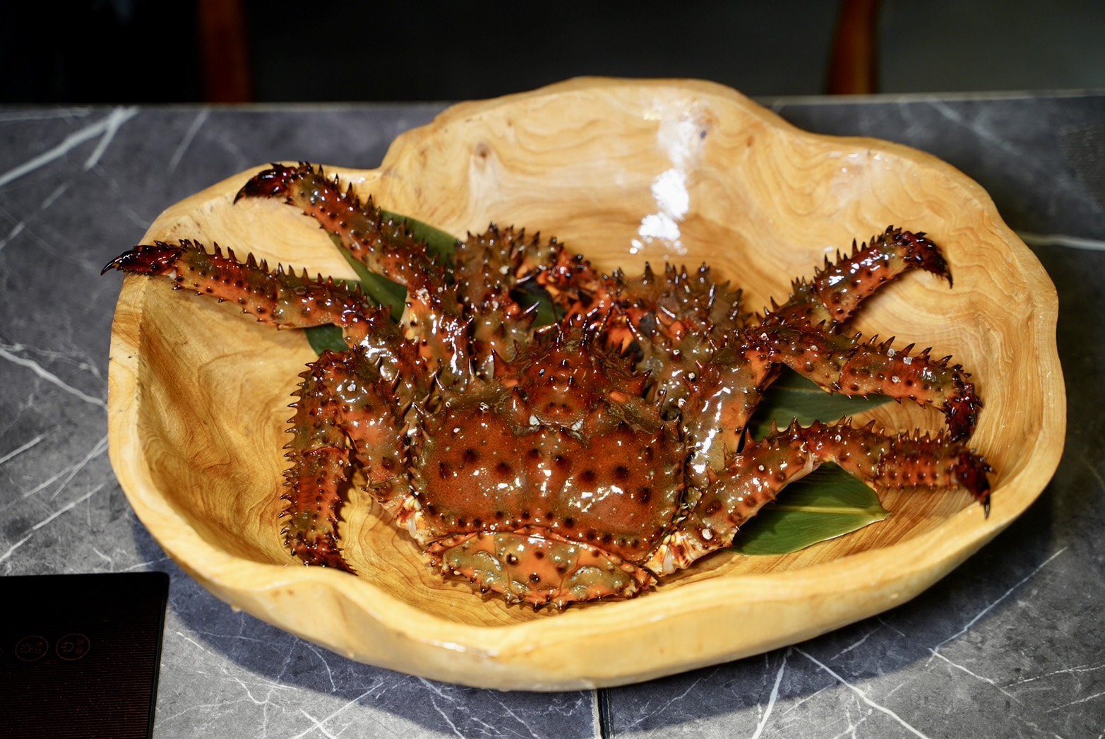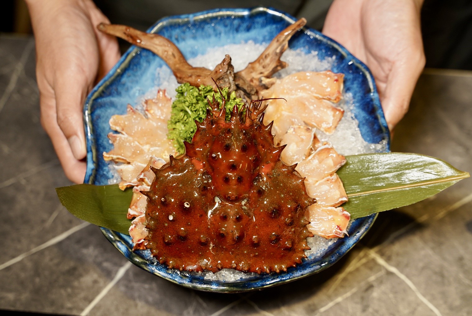 接著主角「花咲蟹」霸氣登場,服務員直接抓活體上桌讓你先拍個過癮,整隻像披著一層帶刺盔甲,外型有點兇但又很吸睛。