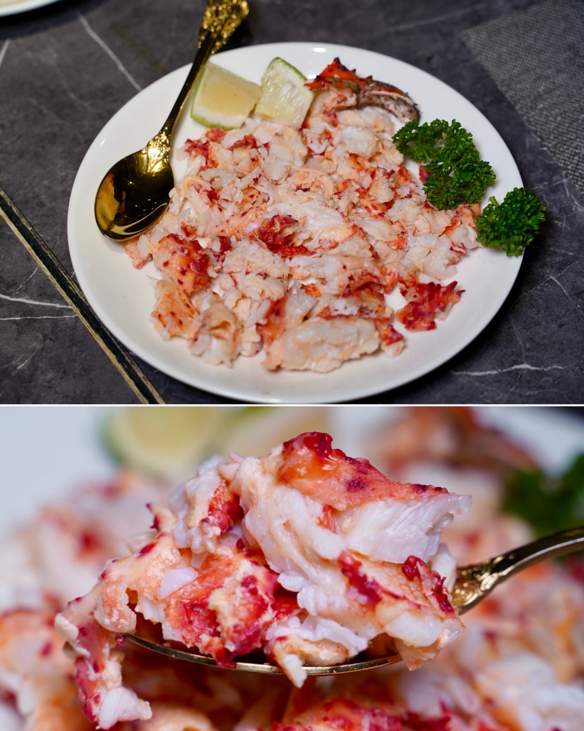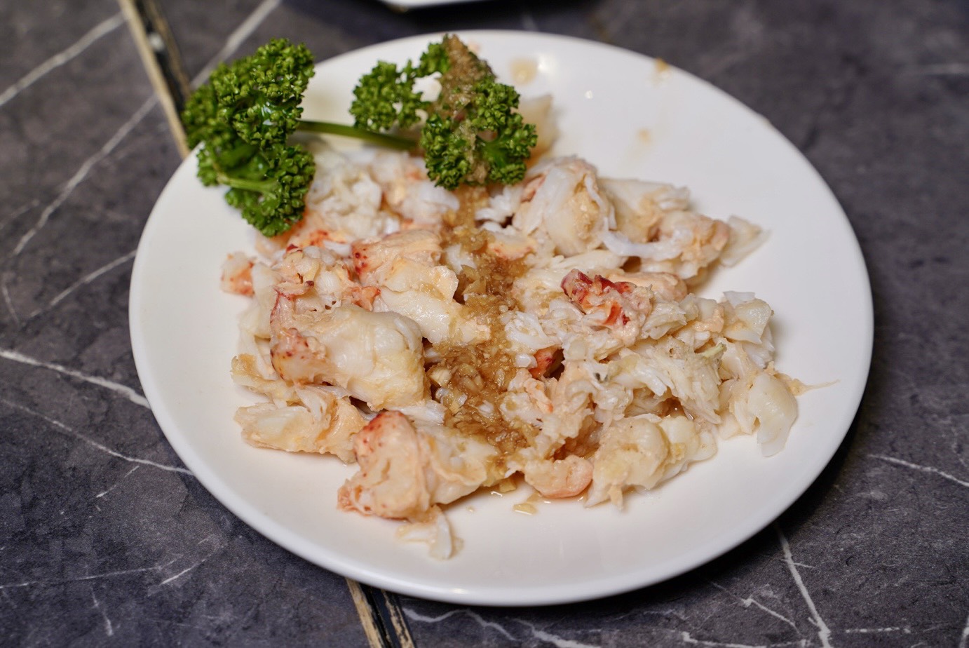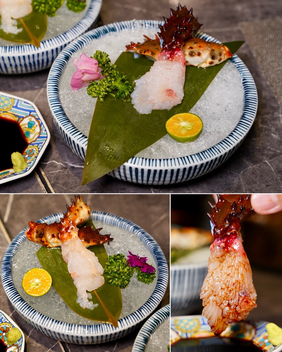 蟹身有先丟進日式昆布湯熬煮,雖然花咲蟹蟹殼比較硬一些,但煮好後廚房會幫底取肉出來,這點真的超貼心!由於花咲蟹生長在比較冰冷的海水裡,所以肉質不會散散的,咬起來會有明顯的回彈感,肉質真的很甜!