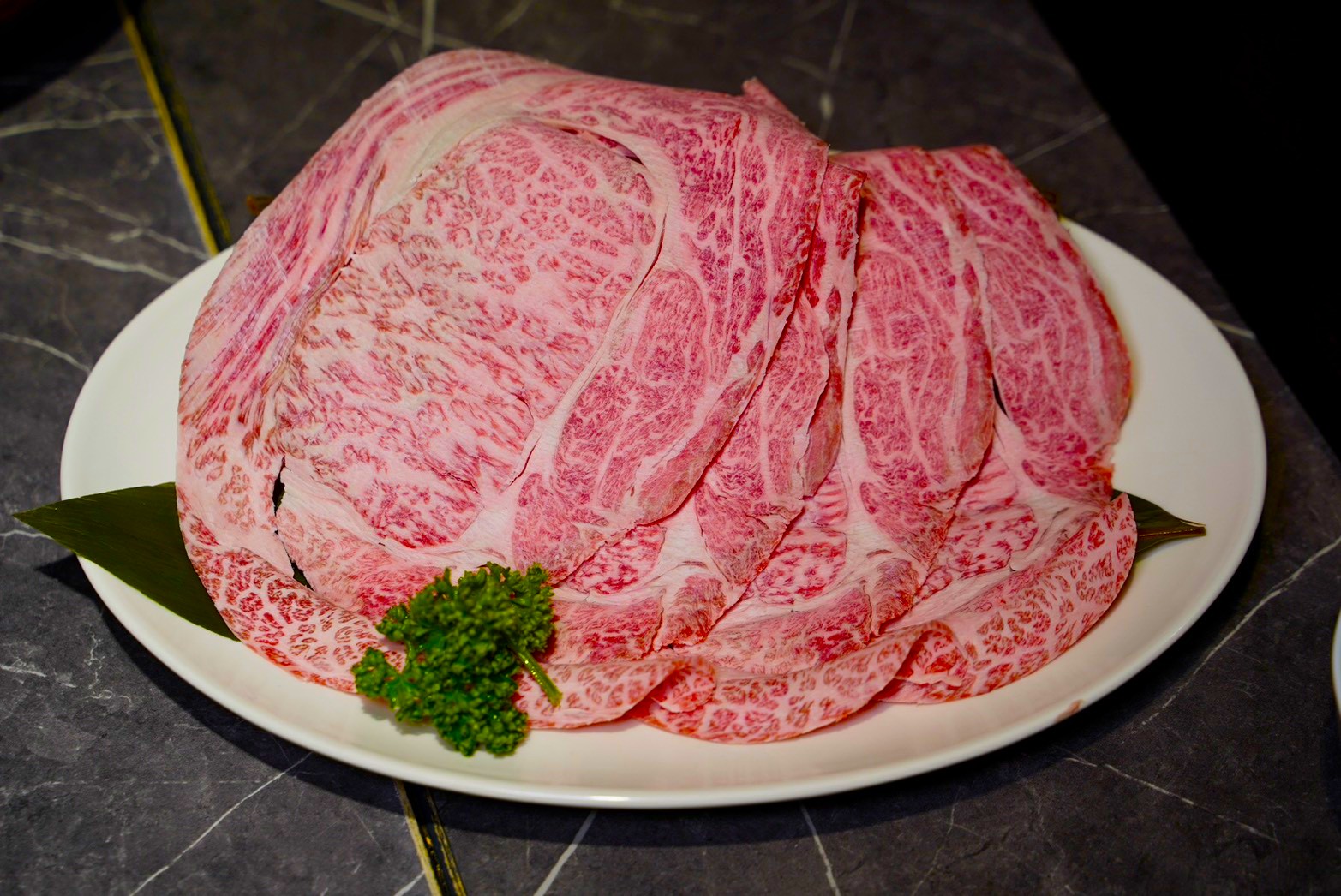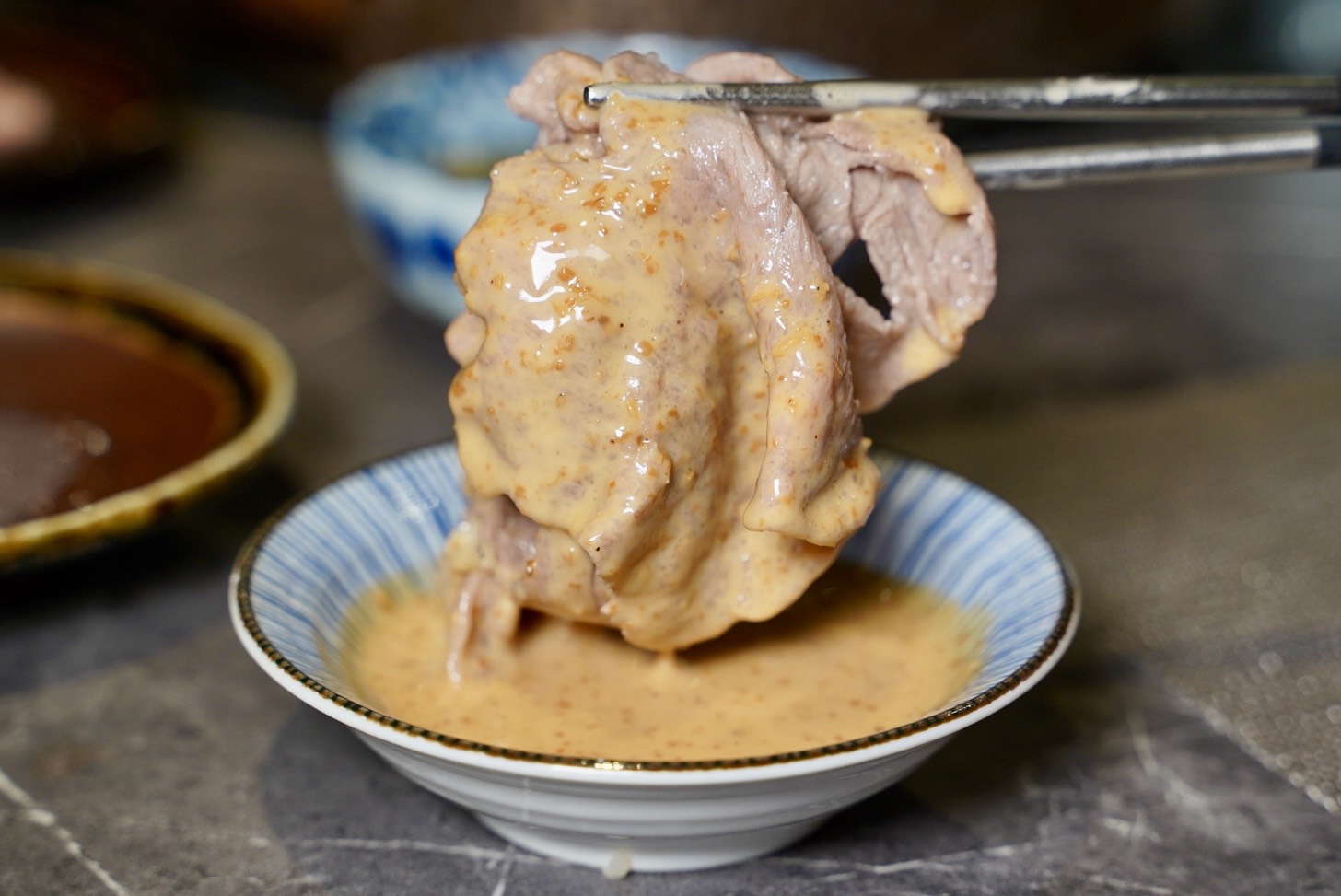 套餐還包含一盤油花超美的「日本黑毛和牛沙朗」,每一片都超級大、油花超美,輕輕下鍋涮個幾秒,入口瞬間化開,油脂香氣在嘴裡慢慢擴散,吃起來超過癮!火鍋會附兩種醬料,桔醋醬很適合沾海鮮、蔬菜,另一個胡麻醬沾肉很對味。