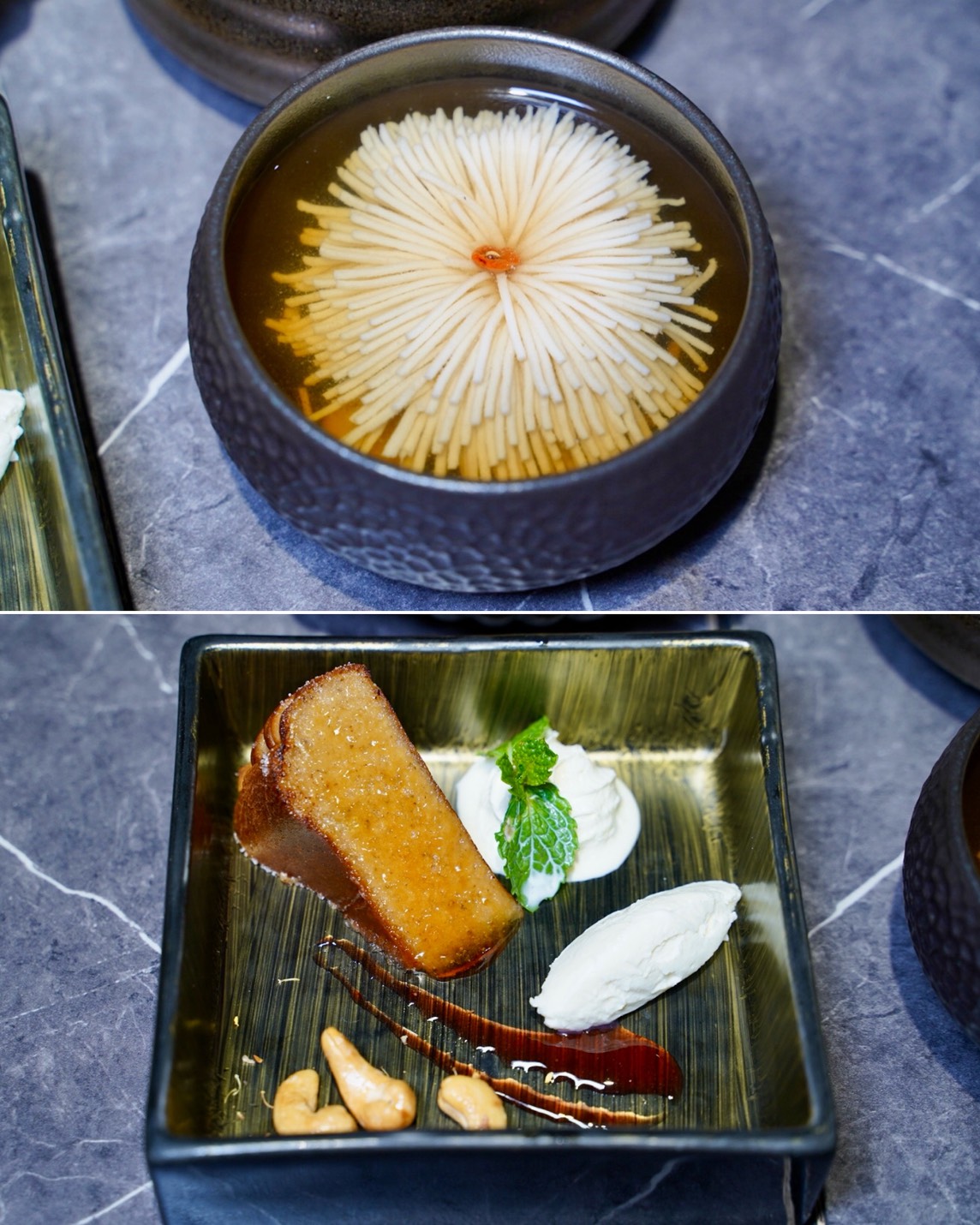 另一道甜點「手切菊花豆腐」完全是顏值派路線,而且是國宴等級的甜點,重點是它不只好看,口感超清爽,就是一碗超高級又精緻的豆花。另外也有精緻擺盤的巴斯克乳酪蛋糕能選擇!