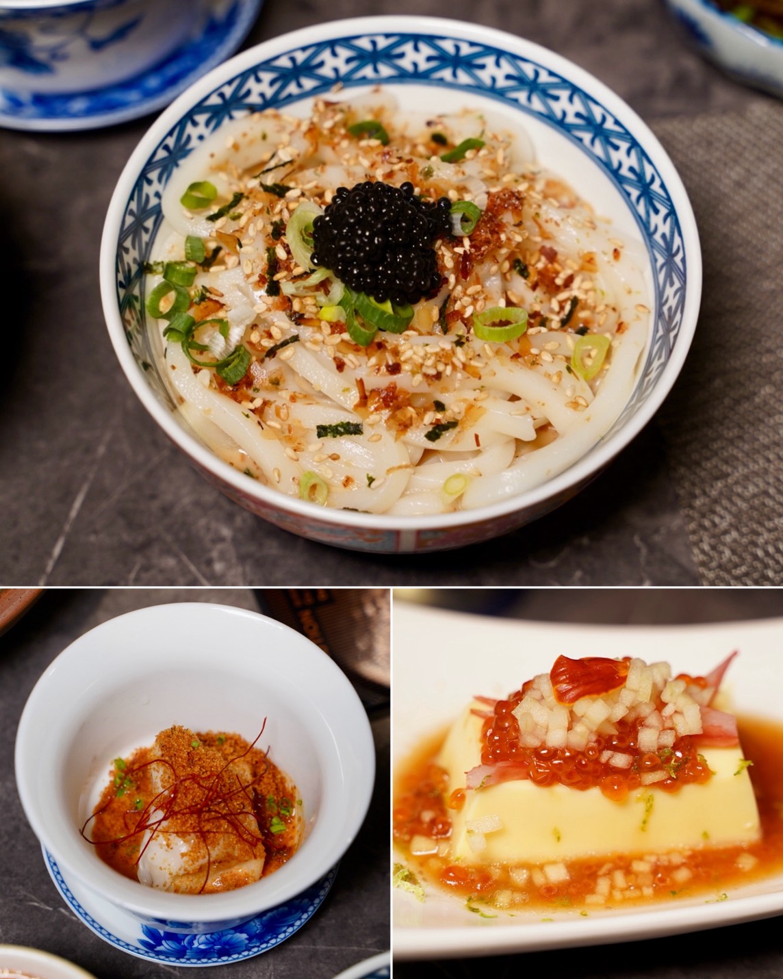「和風蟹肉鮭魚卵豆腐」上面鋪滿了誠意十足的鮭魚卵跟蟹肉,豆腐吃起來很有彈性,淋上和風醬汁後微酸微甜,真的很開胃。副餐如果不想吃白飯,可以免費換成「手工鮮蝦雲吞佐野生烏魚子粉」,咬下去是蝦仁混合豬肉的內餡,誇張的是上面還灑了野生烏魚子粉,咬下去瞬間真的鮮美到不行,每想到平價美食可以做得那麼高級。白飯也能換成「魚子醬胡麻冷麵」,給上一大勺黑金魚子醬,伴著胡麻醬及彈牙烏龍麵,整個奢華到不行。