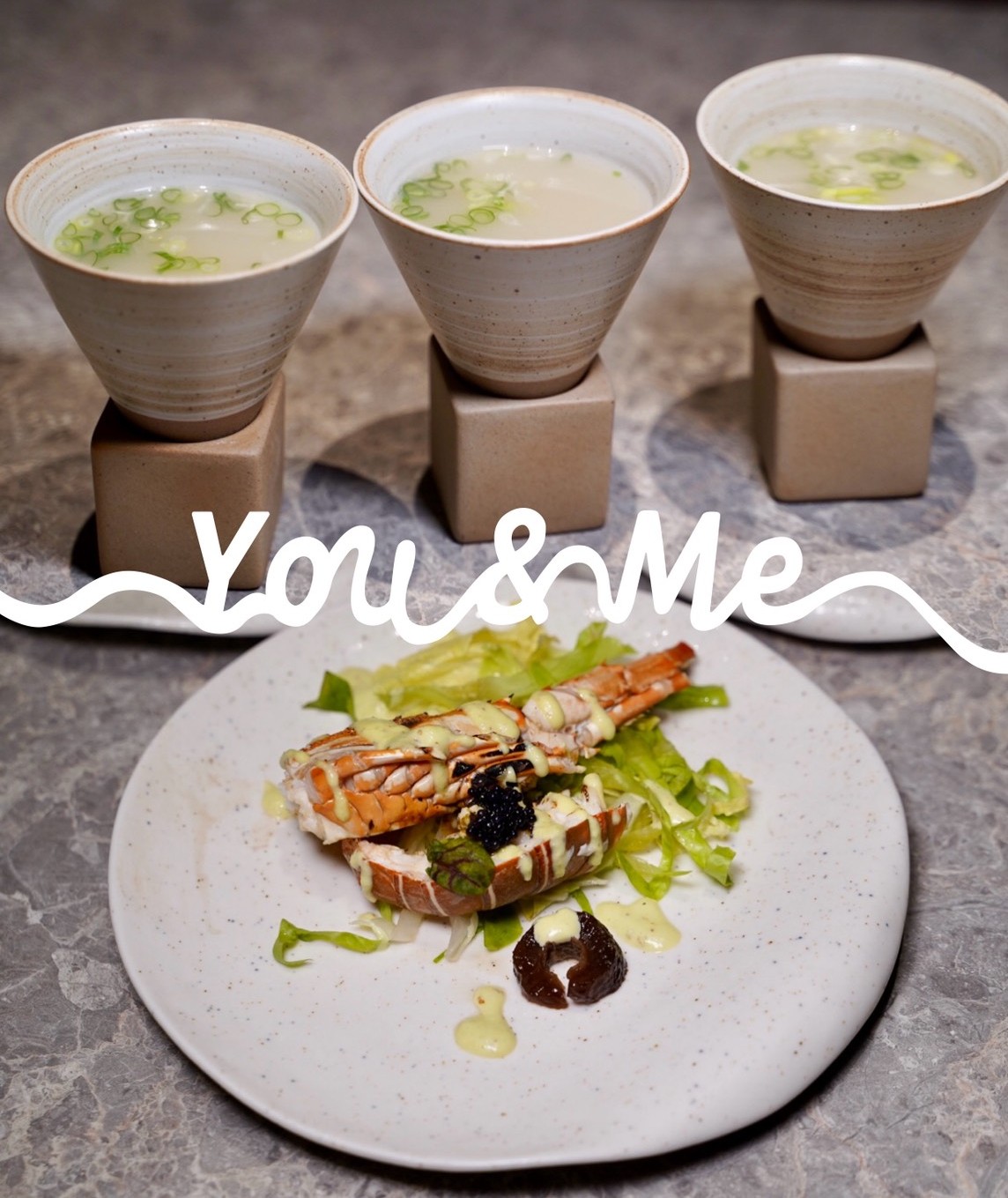 本次用餐體驗的是$2680的「夏日 本和牛燒肉套餐 」,一坐下就先來碗熱呼呼的「迎賓燒肉雞湯」,撒上蔥花、再噴灑檸檬汁提味,喝起來就像清爽版的雞白湯,濃郁順口又不死鹹,超讚!「開胃菜」是道龍蝦沙拉,一上桌就超吸睛!還有魚子醬、海參點綴,相當清爽開胃。