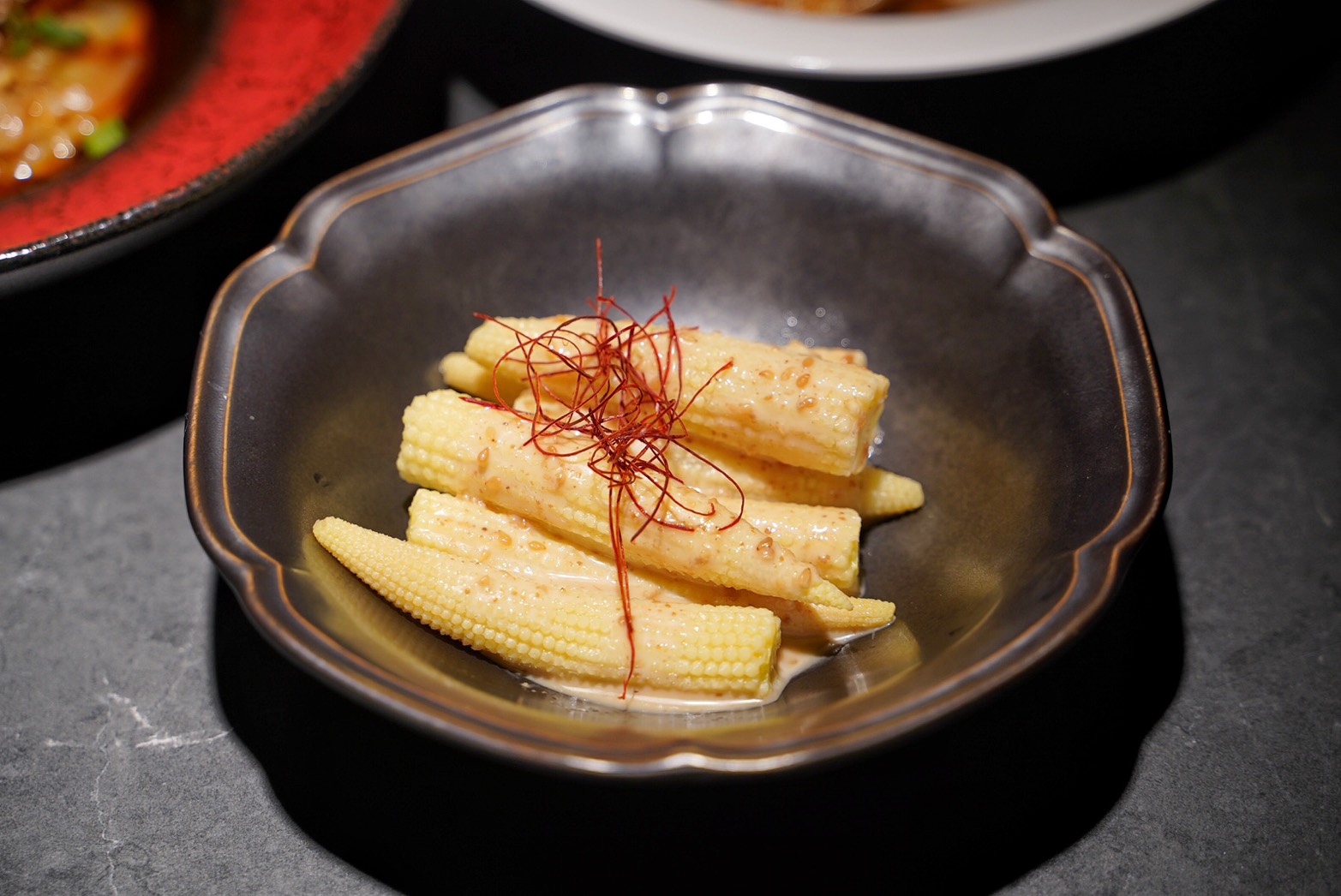 前菜「胡麻玉米筍」是以胡麻醬配上爽脆玉米筍,簡單又美味。