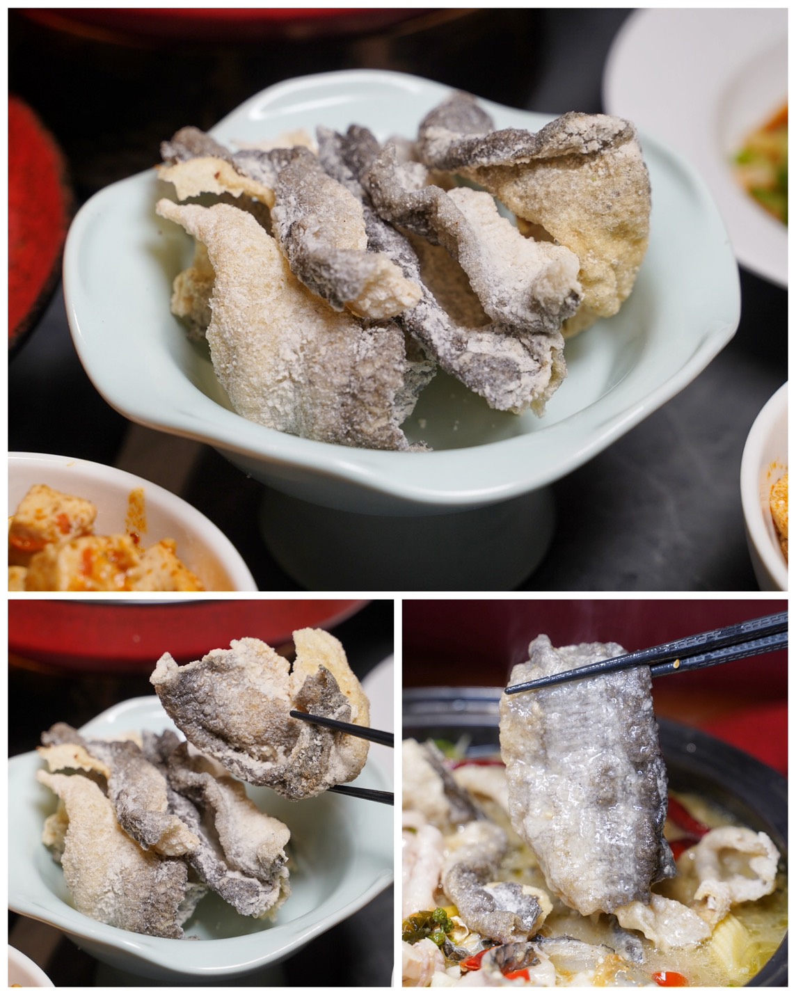 「江魚美招牌酸菜魚」辣度、麻度都能客製化調整,我覺得最棒的是吃起來油膩感不會很重,湯底是用魚骨熬煮,加上90天發酵的酸菜下去熬煮,喝起來格外濃郁又甘甜~當天有升級成龍膽石斑魚片,所以膠質感更是豐富,每一口都喝得到酸、鮮、麻、辣,滋味一次滿足!不誇張整鍋被我喝光光,而且吃完居然不會口乾舌燥,這鍋真的有夠讚!對了,如果你不吃辣,這裡也有番茄魚可選擇唷!