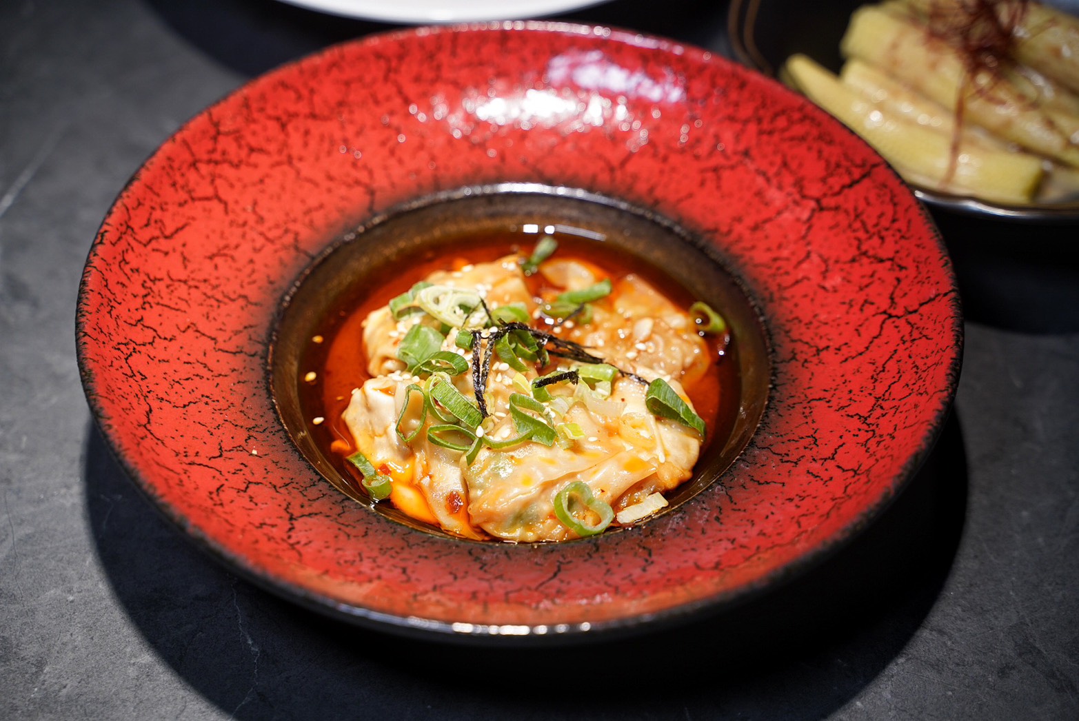 冷盤「川香口水雞」去骨雞腿相當彈牙多汁,吃起來充滿花生堅果香氣,還帶點紅油的麻辣感,搭配爽脆的小黃瓜,非常有層次感。