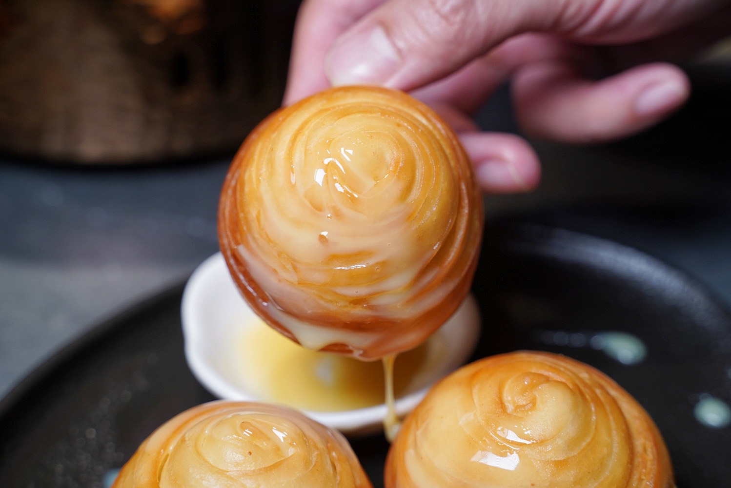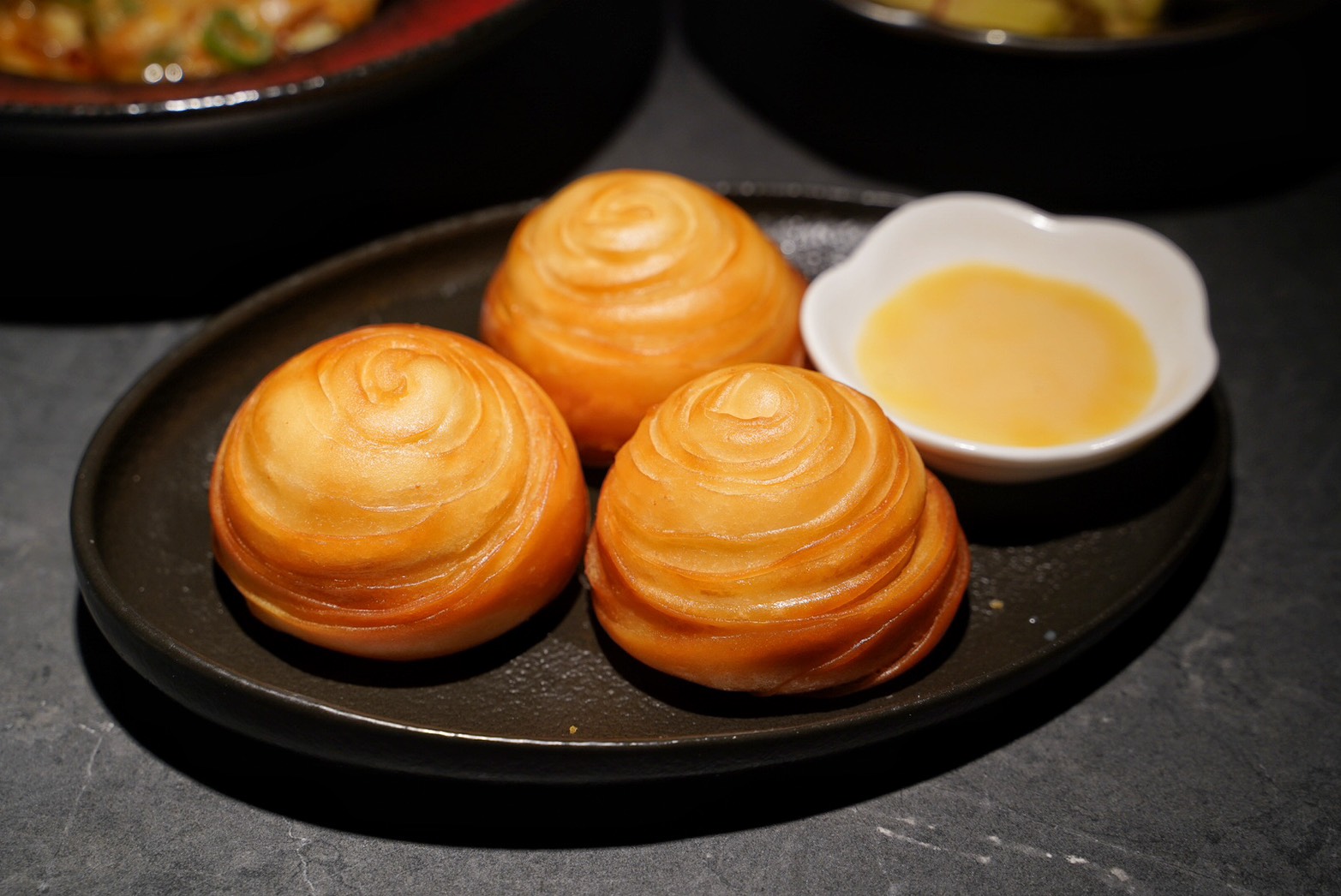 「酥炸螺絲捲」造型超可愛!我看幾乎桌桌都有點,所以就也趕緊加點一份!剛上桌真的讓人眼睛一亮,外皮炸得金黃酥脆,咬下去卡滋作響,內裡則是濕潤鬆軟,帶著饅頭香甜味道,重點是完全沒有油膩感或油耗味,單吃就很可以,淋上煉乳更是加倍好吃,這道真的必點!