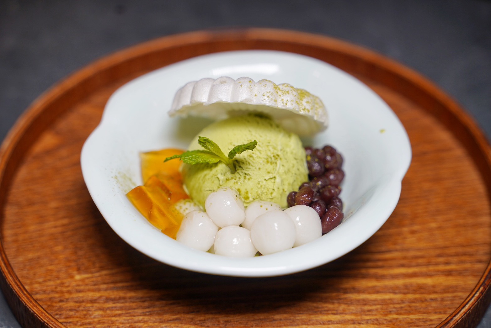 另一道「抹茶小圓冰淇淋碗」整個超有日式風情!抹茶冰淇淋抹味很濃且甜度適中,搭配紅豆泥、白玉湯圓、茶凍,整個口感更豐富,而且完全不甜膩,抹茶控必點!