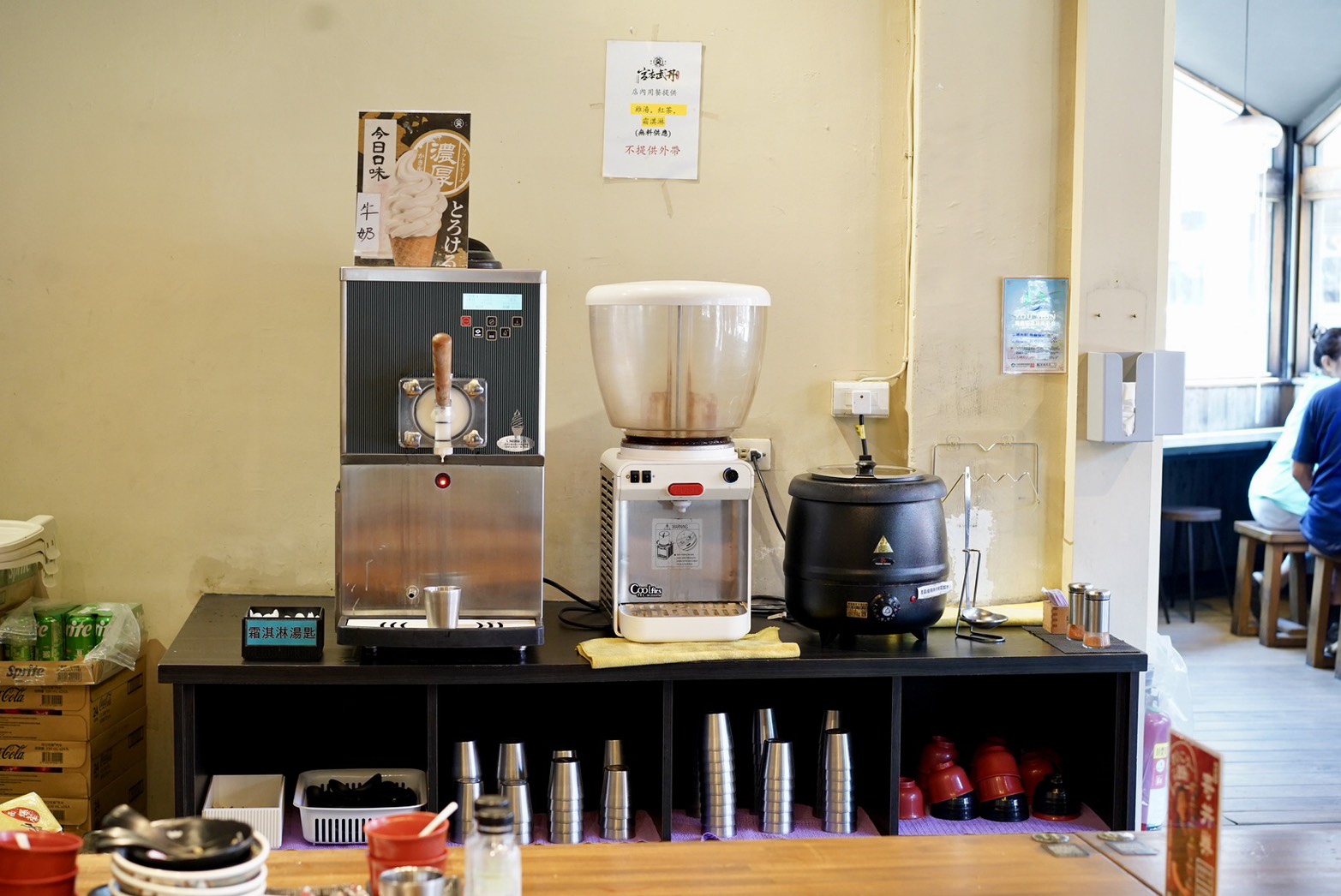 小小的自助吧區有免費雞湯、冰淇淋、紅茶,餐具自取,所以內用不收取服務費喔。