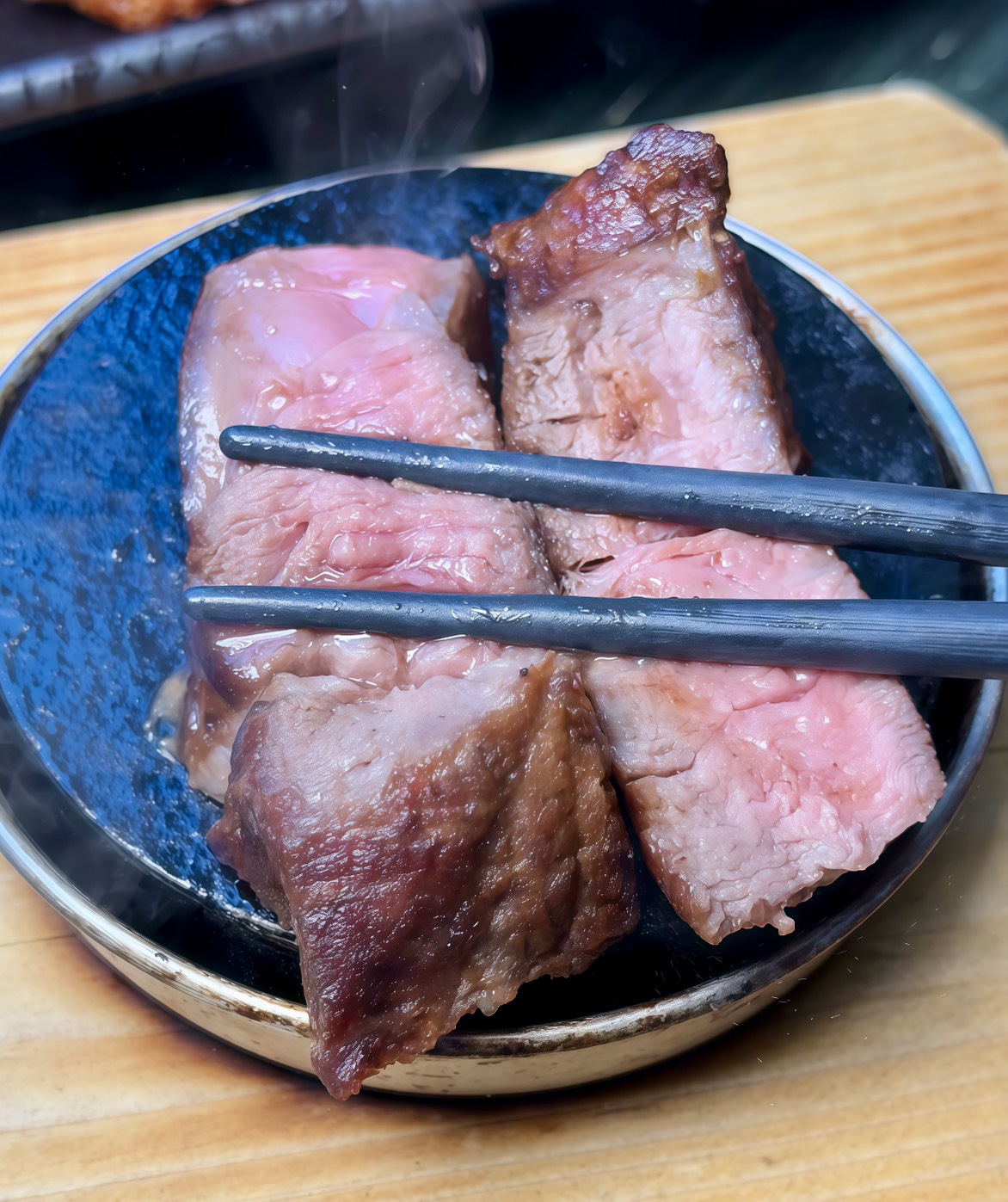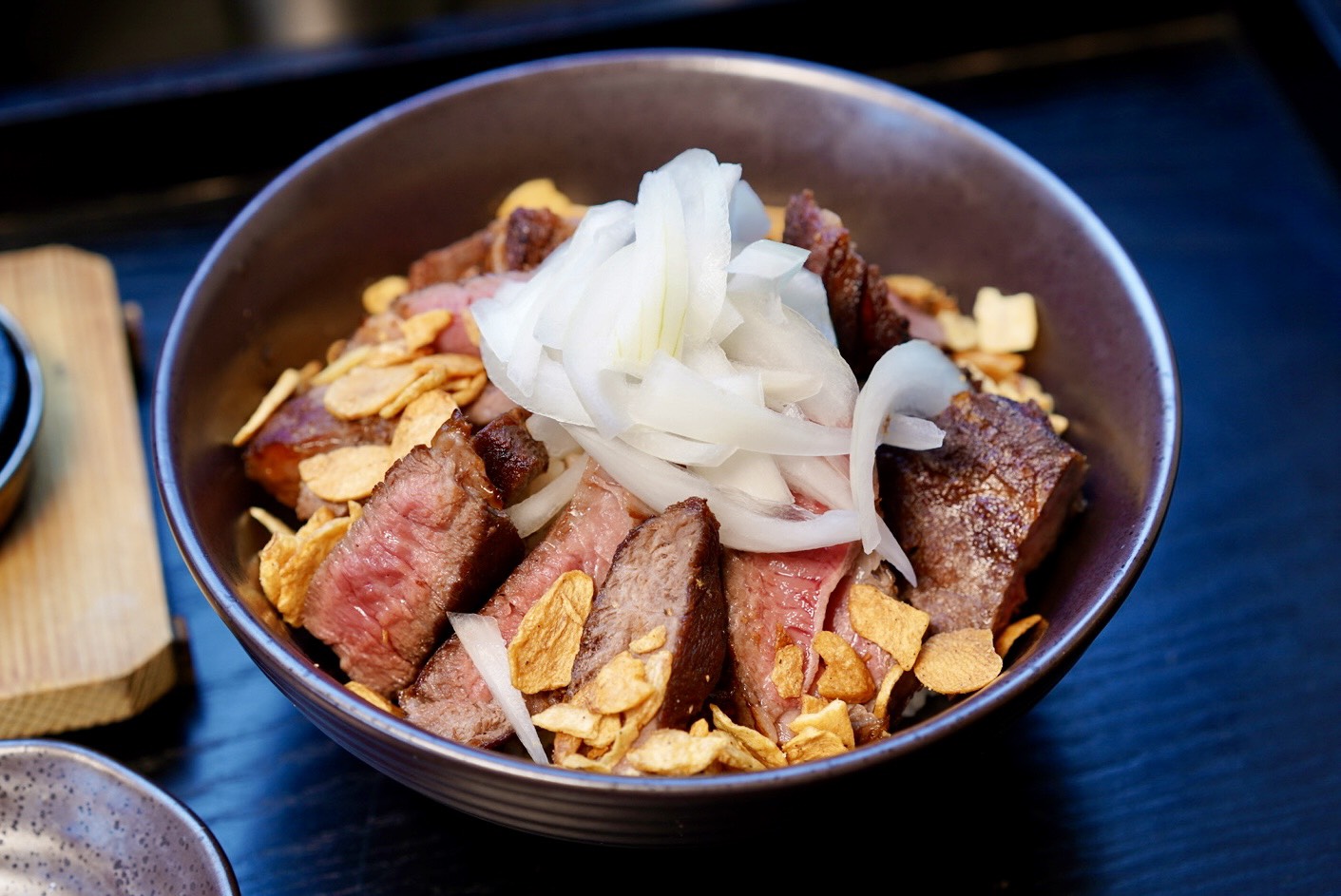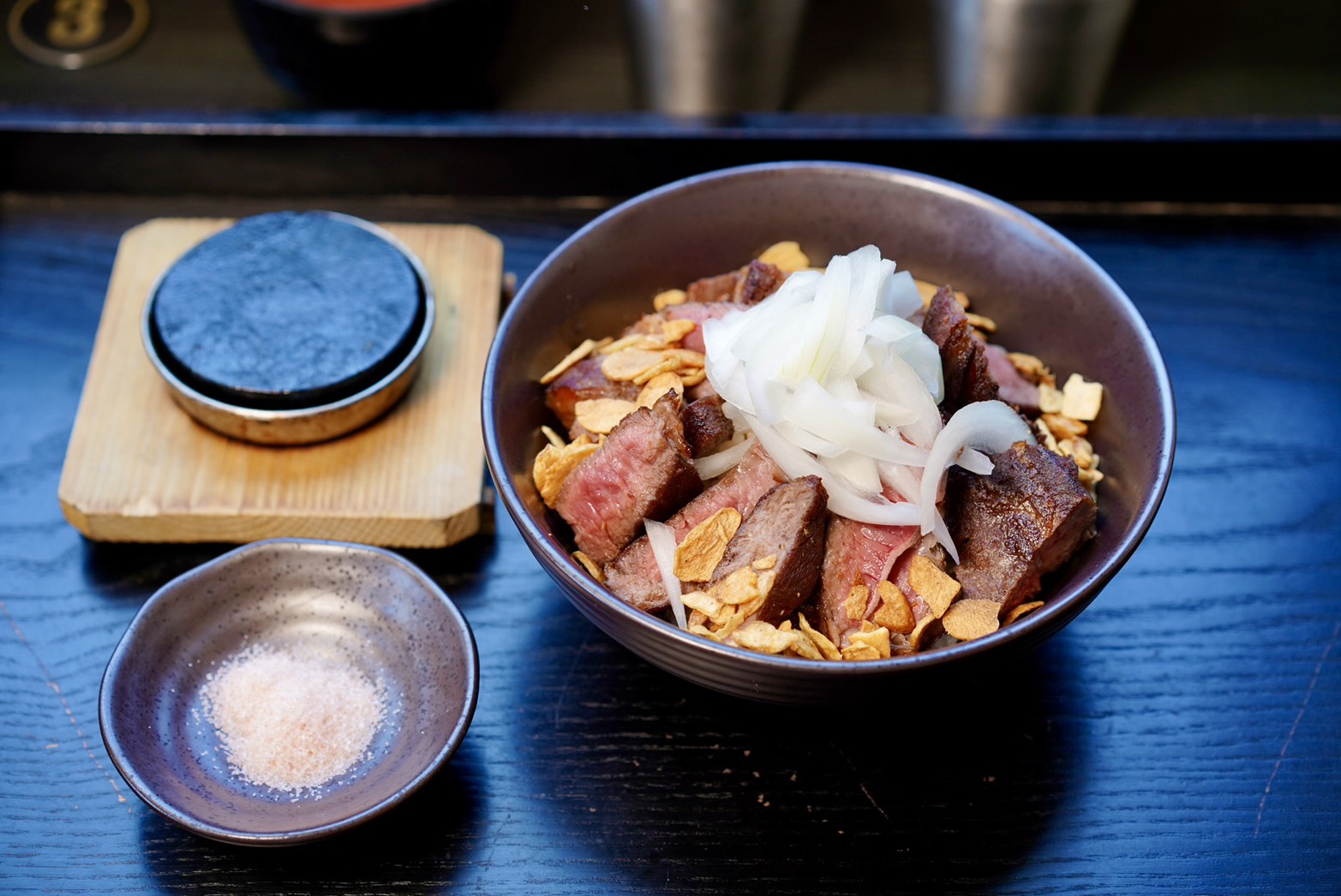 「極上大勢牛排丼」還會附上一顆滾燙的加熱石!把粉嫩的牛肉往上一放,馬上『吱吱作響』狂冒煙,現場直接變小型鐵板秀! 咬下去軟嫩又帶點咬勁,搭配蒜片跟洋蔥更過癮~
