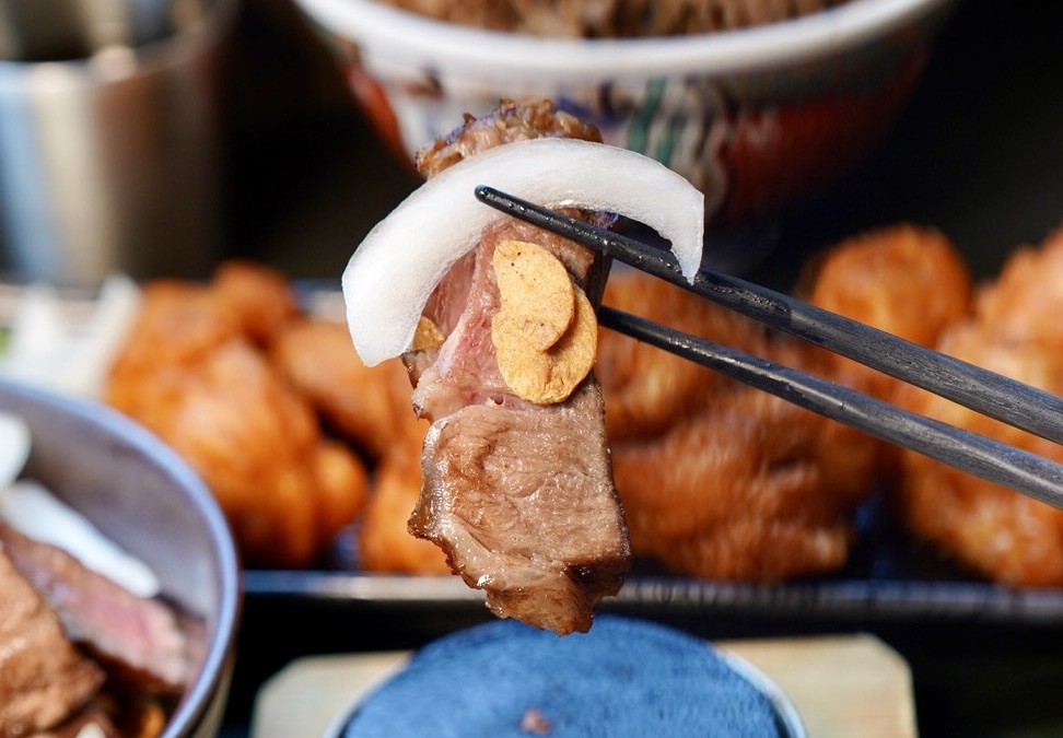 【宮本武丼|直火燒肉丼】苗栗頭份最硬派的日式丼飯,滿滿肉山吃起來超過癮~極上大勢牛排丼還附加熱石,可自行調整熟度,內用還有免費雞湯、霜淇淋、紅茶!