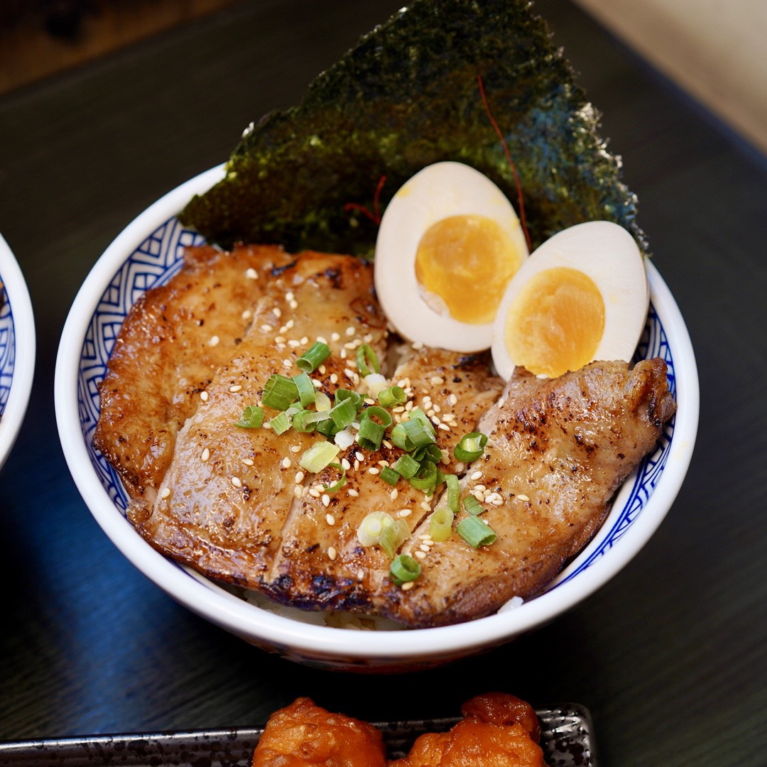 「柳生火烤雞腿丼」也是推薦必點!額外加溏心蛋看起來更豐盛~整塊去骨雞腿排超大一片,把飯整個都覆蓋掉,外皮烤至微焦並帶有炙燒香氣,肉質厚實且鮮嫩多汁,一口咬下去超滿足~