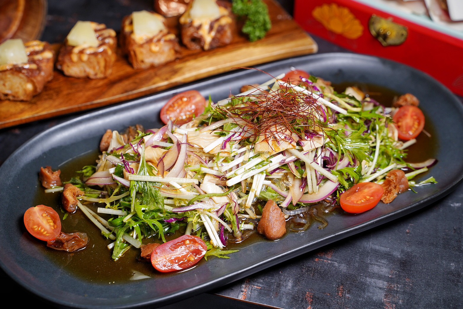 創意中式料理:大拌菜、富貴雙方、金沙糯米飯、孜然寸骨、石頭蝦、蛤蠣粉絲煲、百花油條