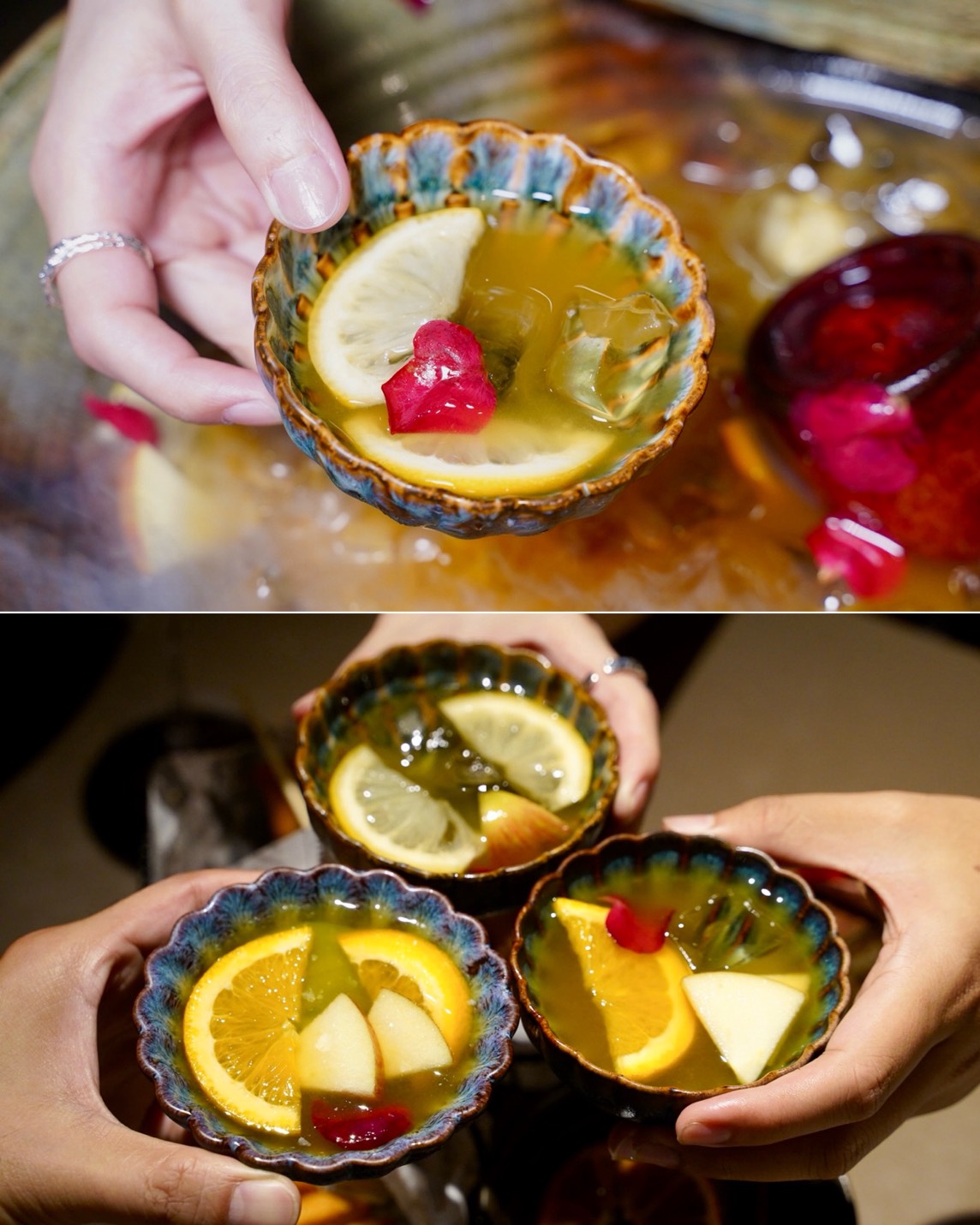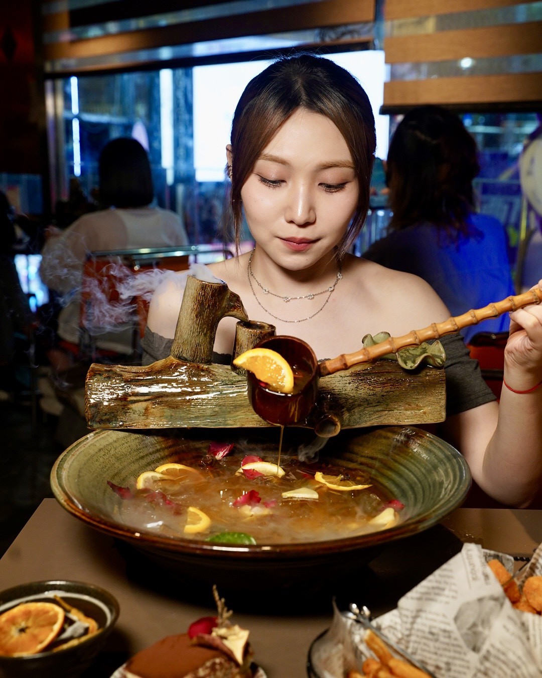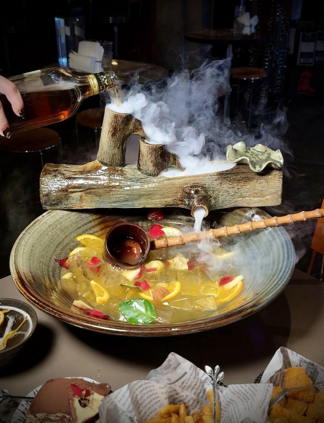 無心戒酒互助會」每間店都有自己的特色調酒,武昌分會必點的絕對是這一大缸的「Punch 調酒」,當天點的是「轉大人的長島水果冰茶」,直接用臉盆裝酒,重頭戲是服務員還會再倒入一整瓶特製烈酒,那畫面就像酒泉瀑布流進缸裡,裡面還有水果片、玫瑰花瓣,整個煙霧瀰漫超有氛圍,重點是超好喝,味道根本就像水果茶,跟朋友聊個天,不知不覺就喝光光~