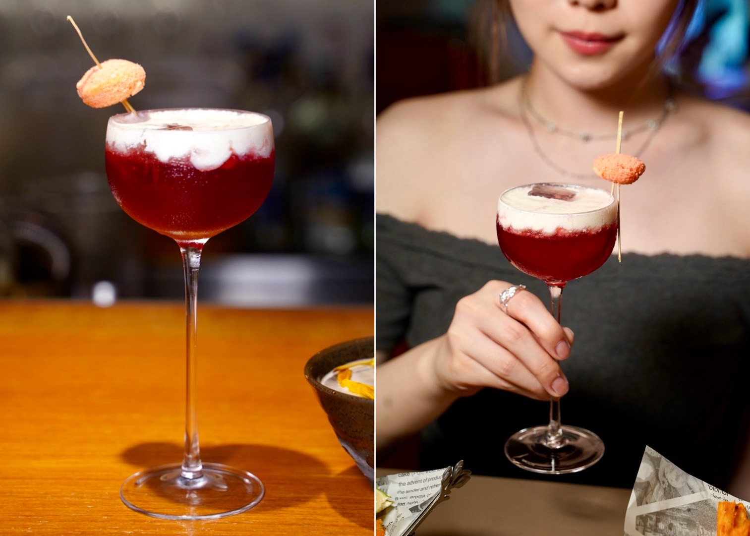 竟然有甜點風味的調酒!當天點的是超夢幻的「台式馬卡龍」,上面鋪上厚厚一層綿密奶蓋,一入口先是微酸莓果香,接著是乳酪滑順濃郁,整個在嘴裡化開的感覺,根本就是杯用喝的甜點。