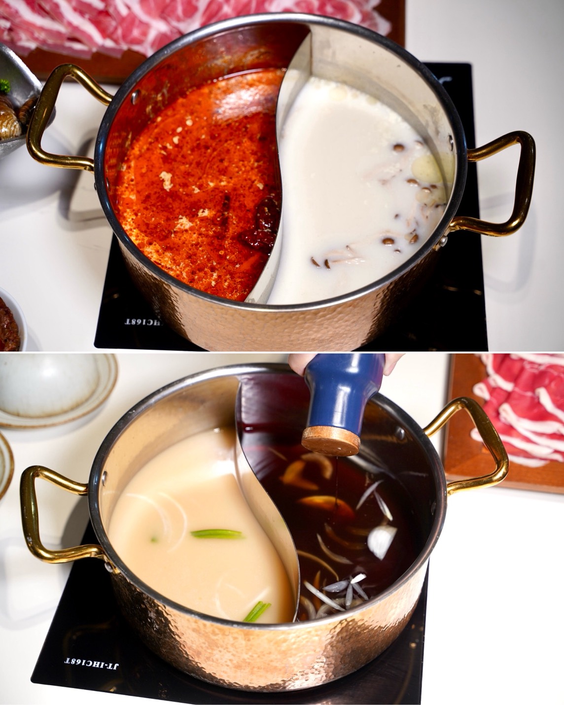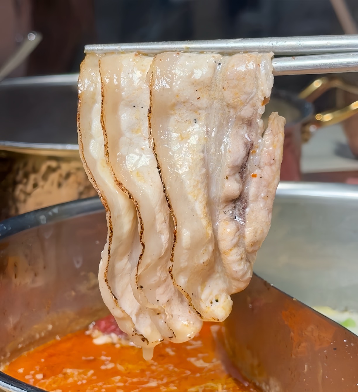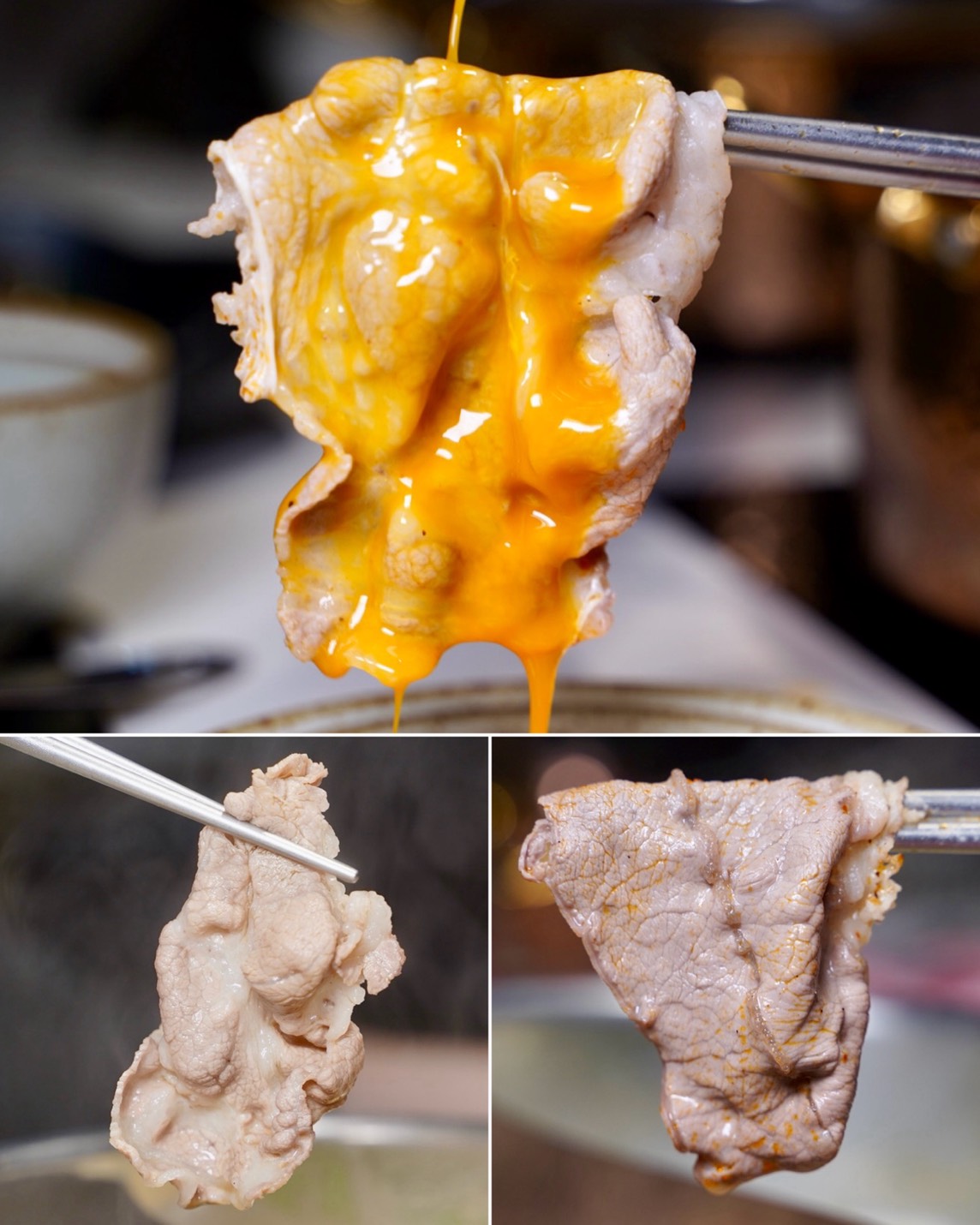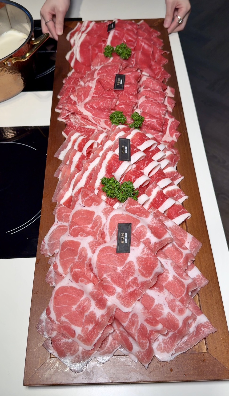 我必須說他們家火鍋湯底真的很厲害,不會越煮越死鹹,吃完也不會口乾舌燥,湯頭都以天然食材熬煮。覺得柴魚昆布當底太清淡,又不想太多複雜的味道,可以試試「老火牛骨髓湯底」,乳白色湯底,濃郁又甘甜,淡淡的牛骨香氣不會很負擔。「日式壽喜燒湯底」的鹹甜比例也很剛好,搭配雞蛋一起享用,就是經典的日式味道。「松露奶香湯底」的松露味超濃郁,奶香也很厚實,整體香氣非常高級,涮肉煮菜也都很適合!個人還私心推薦「麻辣奶香湯底」,有附鴨血跟豆腐!奶香把麻辣變得超順口,辣度剛好不會太嗆,怕辣的朋友也能安心吃!