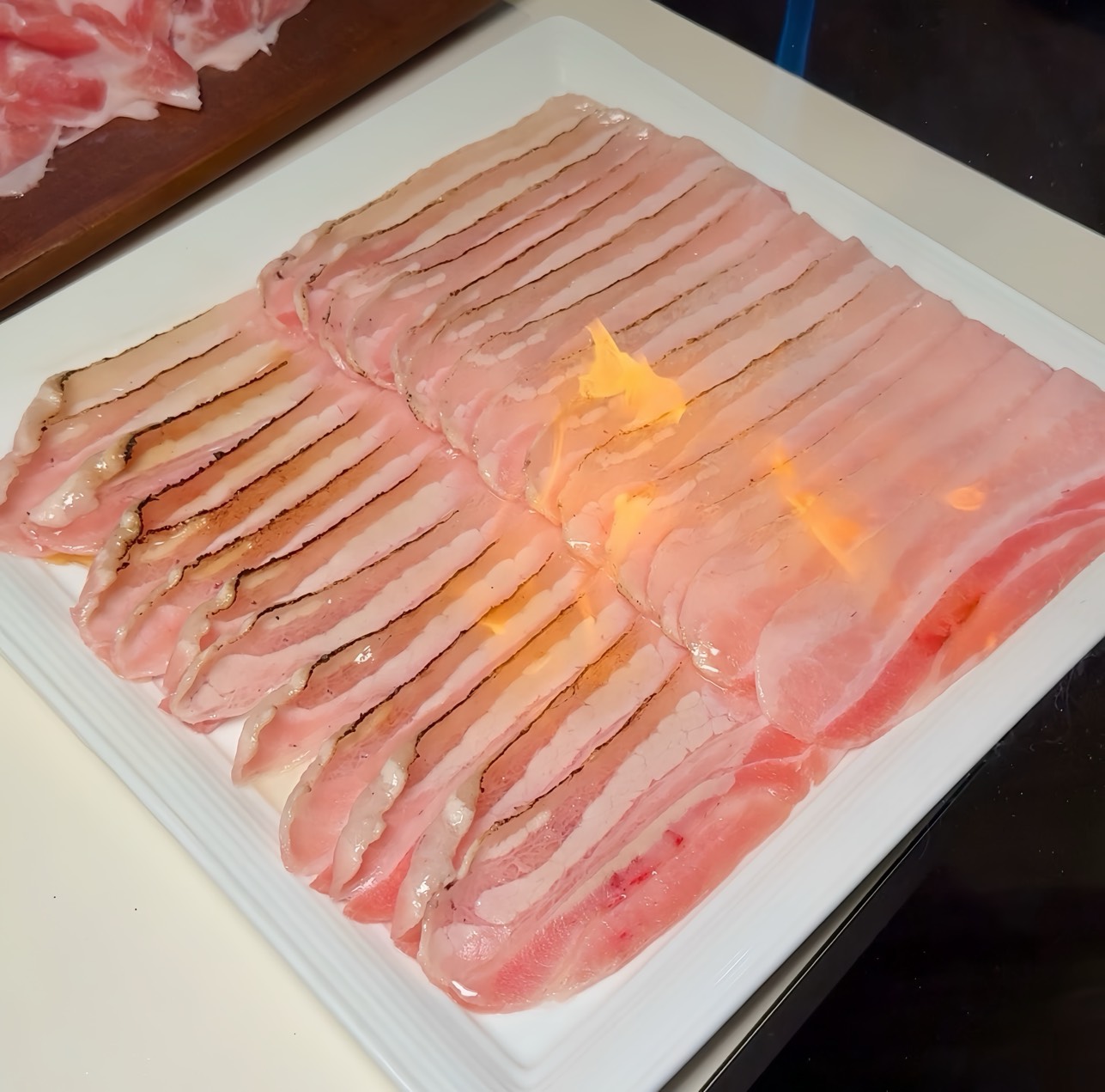 個人套餐肉品很推薦點「台灣亞麻籽炙燒豬五花」,選用以亞麻籽飼養的豬肉,油脂細緻、香氣特別迷人。炙燒後油花瞬間融化,外層帶點微脆口感,咬下去肉汁爆滿、完全沒有豬腥味,還多了一層濃濃的炙燒香。