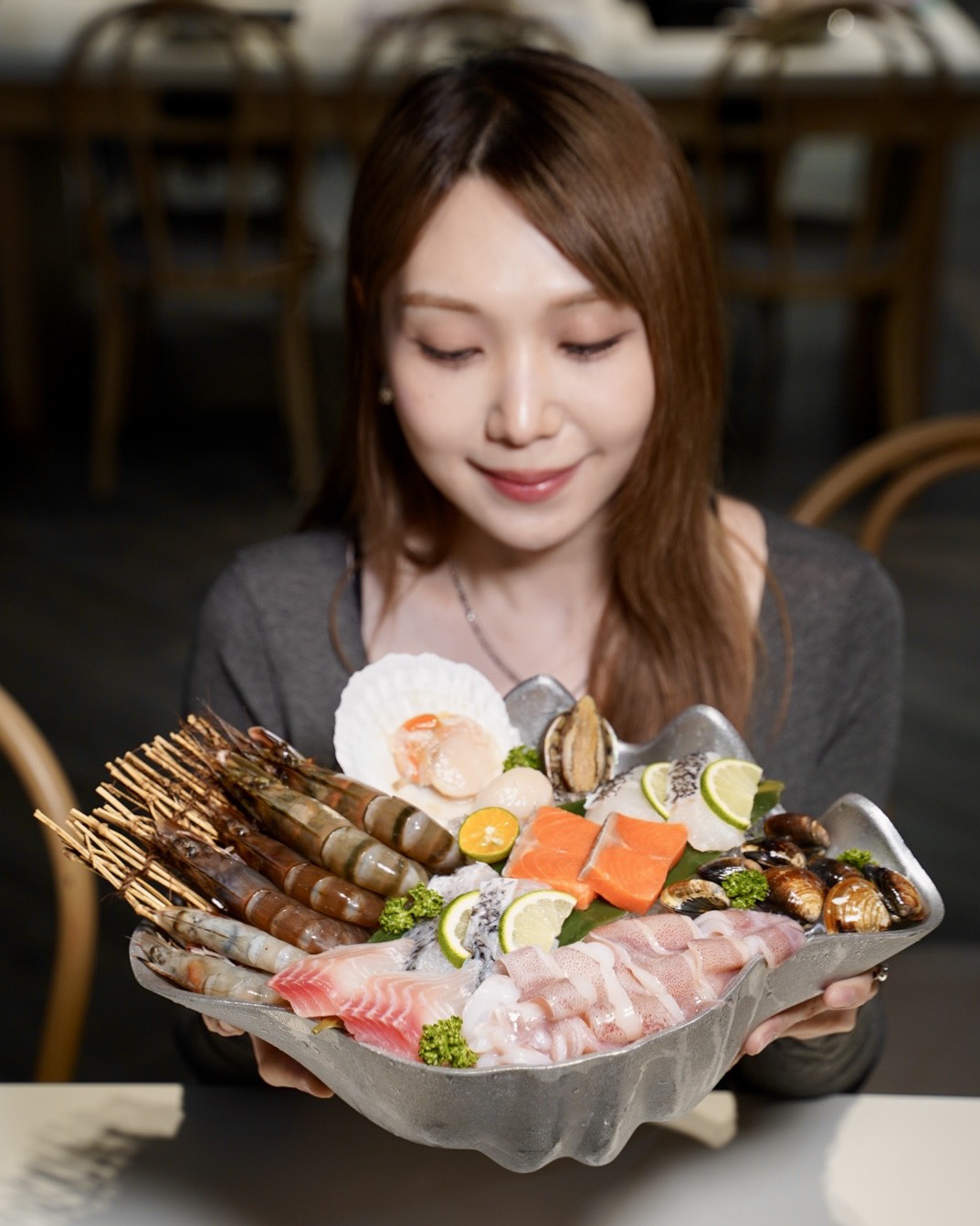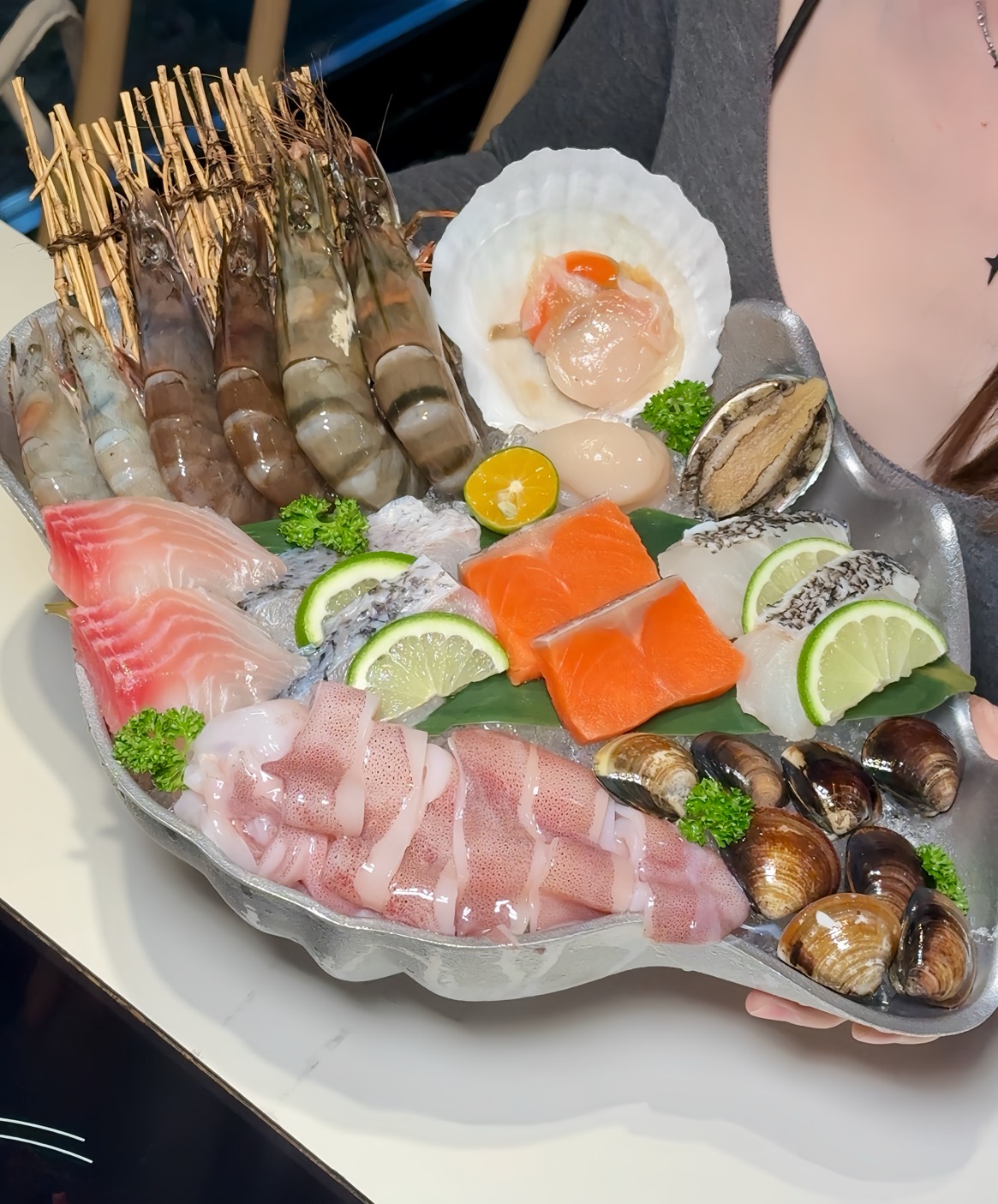 雙人套餐「特盛龍宮海陸鍋」也很浮誇!包含巨大貝殼海鮮船以及一份肉盤,海鮮吃得到巨大草蝦、大白蝦、甜白蝦、東北角小卷、龍虎斑魚片、海鱸魚片、鯛魚片、鮭魚片、蛤蠣、日本干貝、鮑魚、扇貝,林林種種12種海鮮,真的超豐盛!整體吃下也都非常新鮮,尤其是蝦子,非常脆甜,蛤蠣也是大顆飽滿鮮甜,海鮮控點這套絕對能滿足~