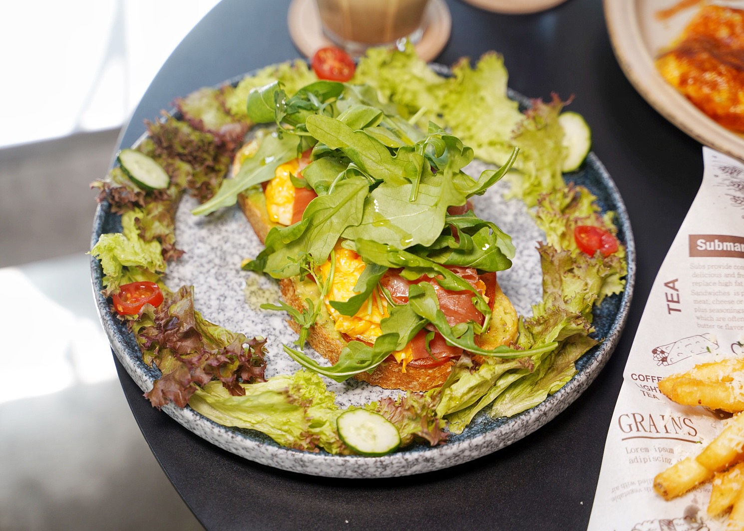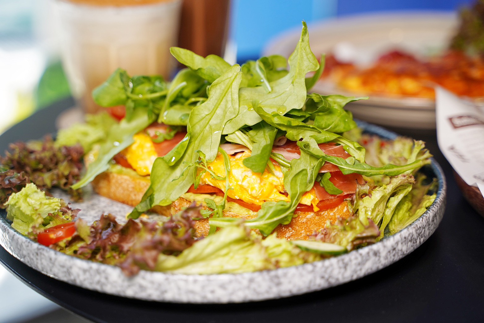「酪梨晨曦」一口咬下去有酸種麵包微酥的口感以及炒蛋的柔軟,還有鹹香的火腿及酪梨醬的綿密,再搭配滿滿生菜,根本是份兼具美味及顏值的開放式吐司。