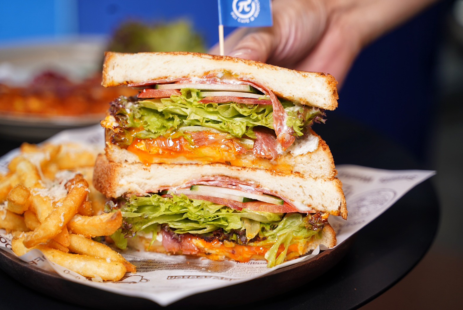 他們家的「PAI招牌大三明治」真的超有誠意,厚厚一大份,咬下去滿滿都是料。吐司外酥內軟,搭配清脆的生菜、多汁的番茄,再加上煙燻牛肉及義式臘腸的鹹香,還有滑順的太陽蛋、塔塔醬的濃郁,層層堆疊的滋味,每一口都超滿足!一旁還附上熱騰騰的脆薯,真的好吃又有飽足感。