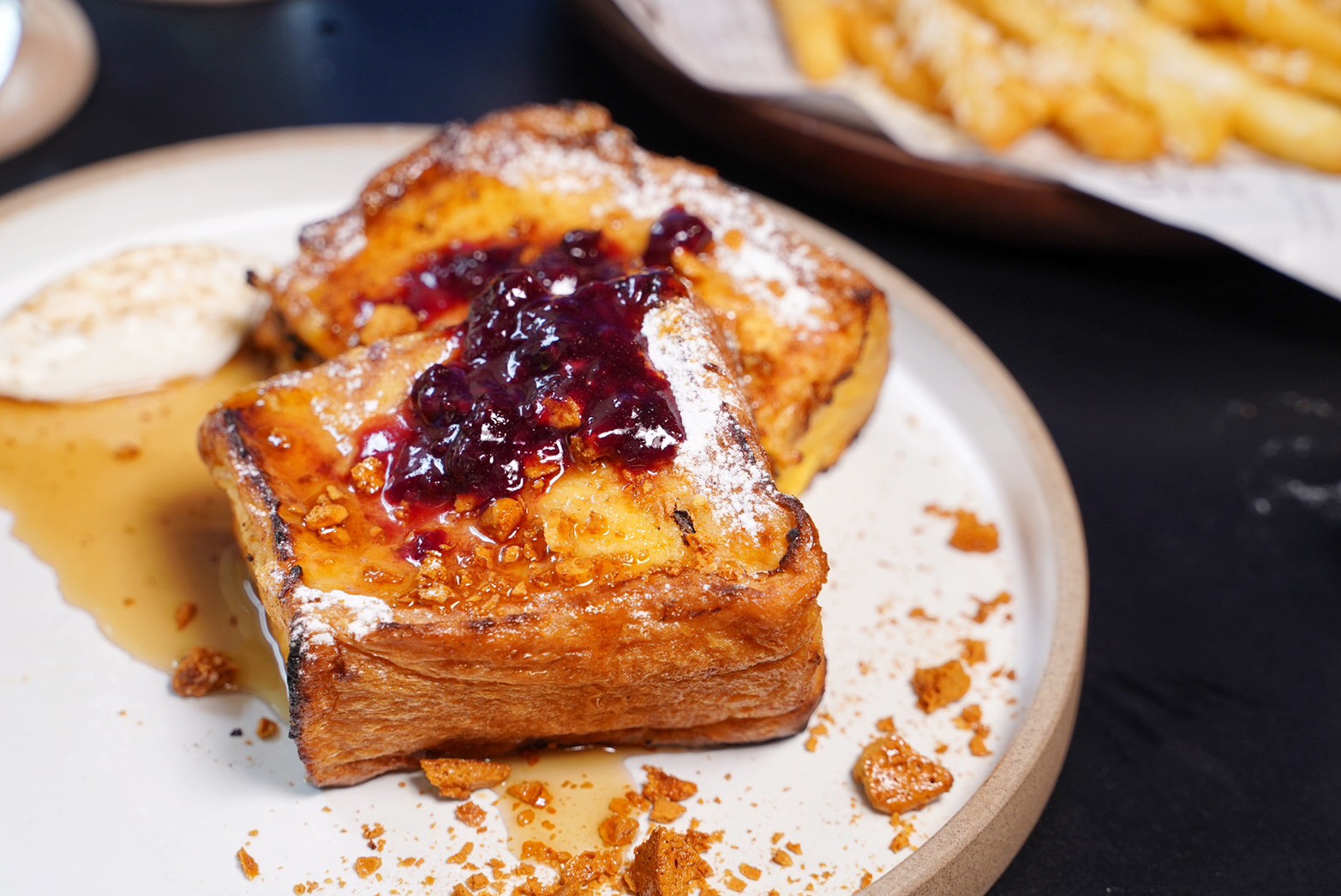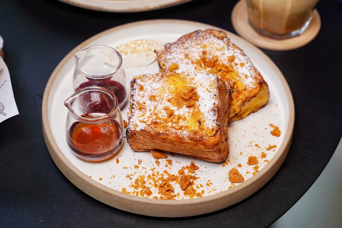 「PAI厚愛你法式吐司」沒點等於白來了!竟然把整塊吐司浸泡在布丁液體三天三夜,最後再煎烤到表皮金黃酥脆,口感外酥內裡濕潤又柔軟,淋上楓糖漿、莓果醬,再搭配上椪糖增添的脆脆口感,每一口都超有層次感,重點是不死甜,而且冷掉一樣美味!不誇張~真的好吃到我們又再加點了一份!