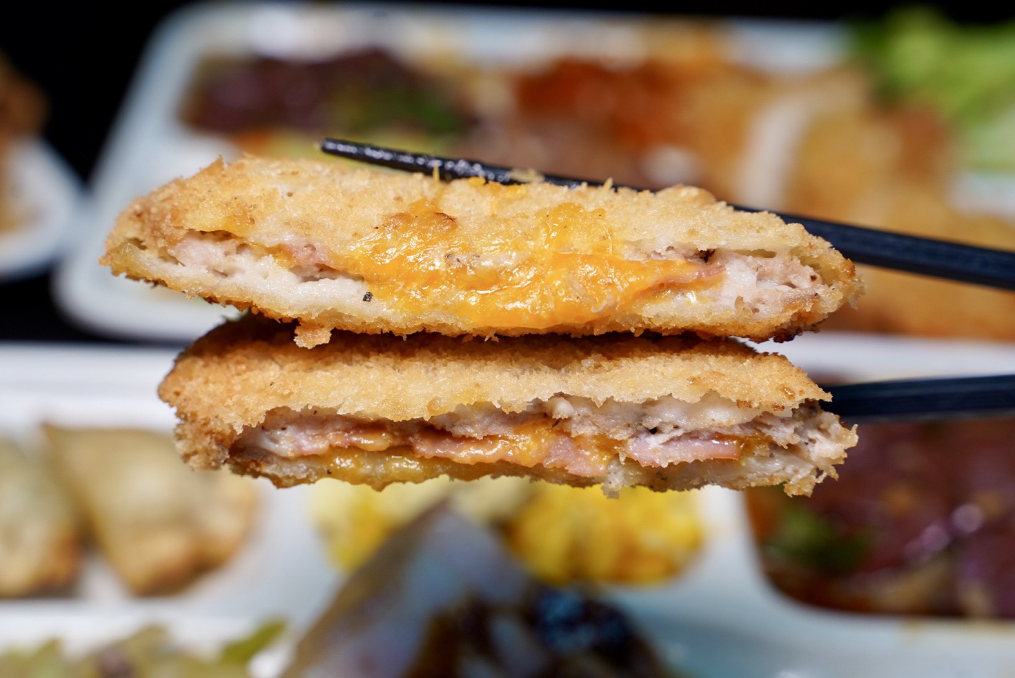 「起司豬排」就是大家學生時期常吃到的藍帶豬排,金黃酥脆外表,裡面是用豬排夾入火腿、起司,咬下去鹹香夠味且層次豐富,熱熱吃起司還會牽絲,吃起來超罪惡但超爽。