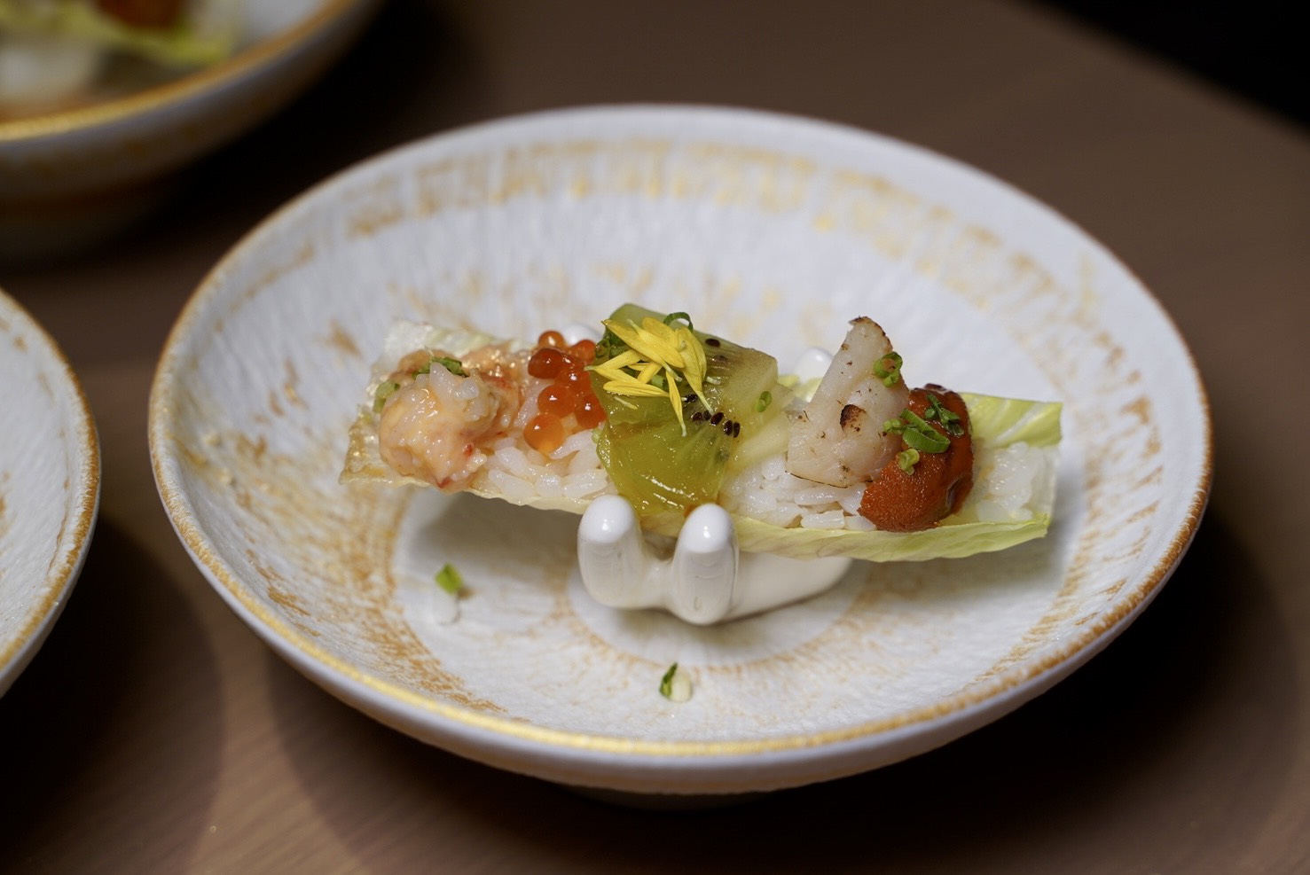「上野庵金粉彩虹棒」這道前菜也很有噱頭,直接在你前面噴灑金粉,這道是以生菜鋪醋飯,依序再放上龍蝦沙拉、鮭魚卵、炙燒干貝以及馬糞海膽,每一口都是滿滿海味。