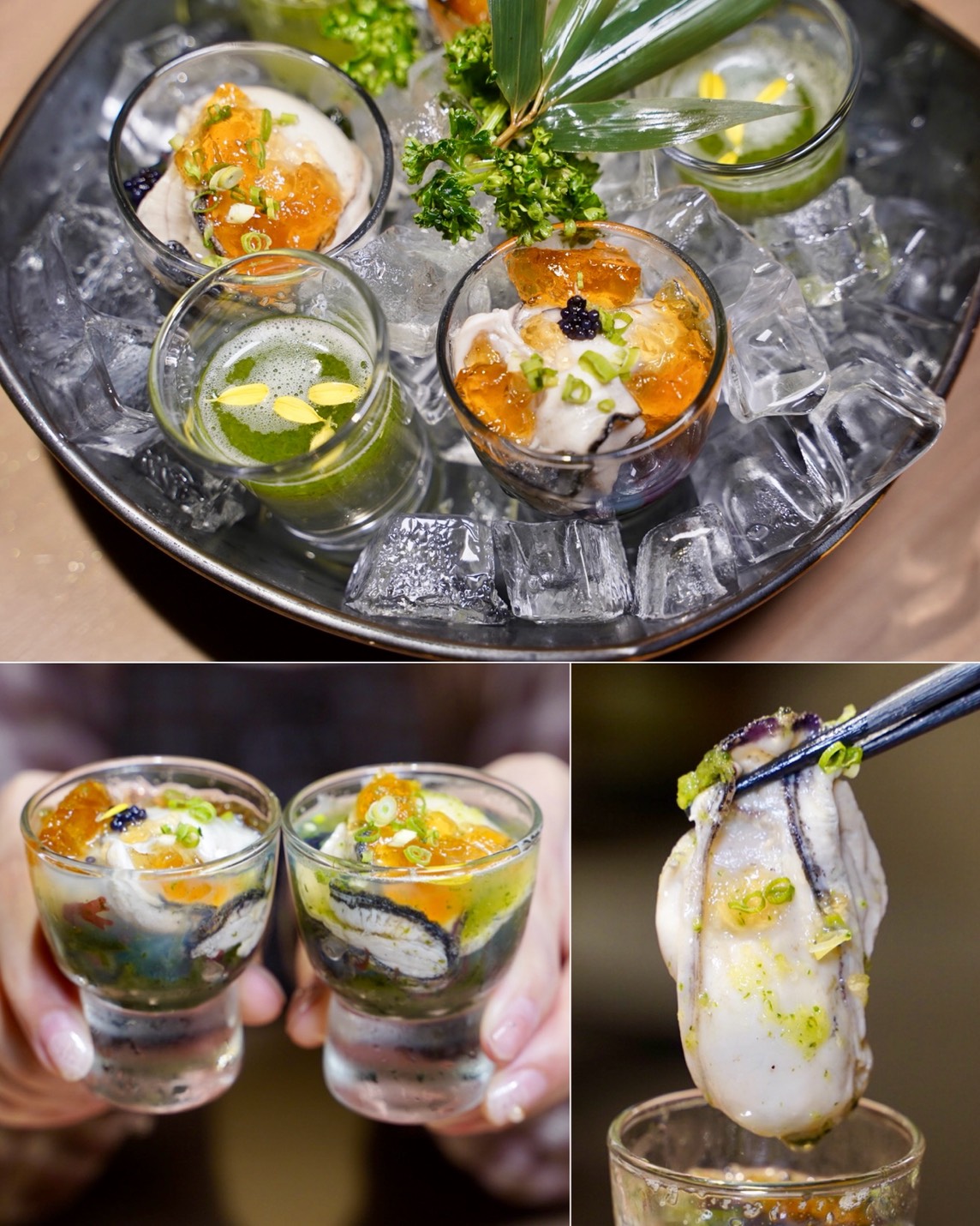 「日本生蠔佐黃瓜蘋果醋」把新鮮生蠔倒入綠色的黃瓜蘋果醋中,點綴著晶瑩的果醋凍、魚子醬和海帶芽,酸甜滋味巧妙地中和了生蠔的海味,瞬間食慾大開。