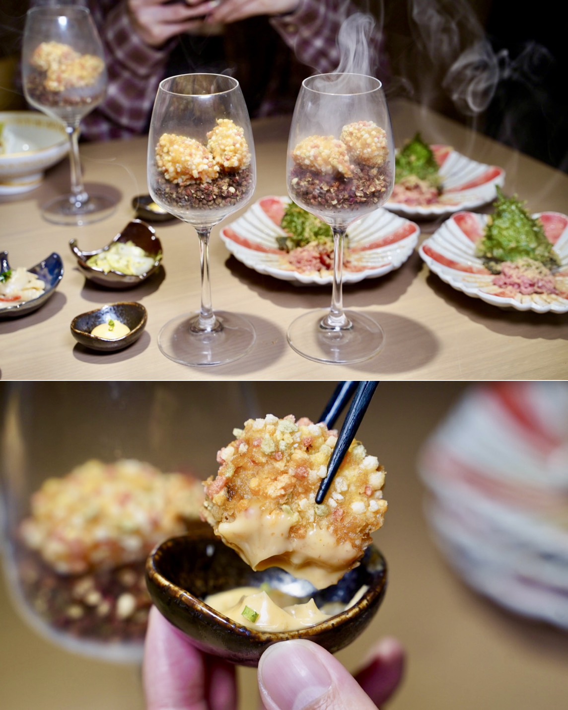 「煙燻脆米安康魚」裝在酒杯裡端上來,打開蓋子的瞬間煙霧繚繞,整個氛圍直接拉滿~超有儀式感!酥炸安康魚外酥內嫩,口感有點像高級版的炸魚薯條,沾上特調川味美乃滋醬更開味。