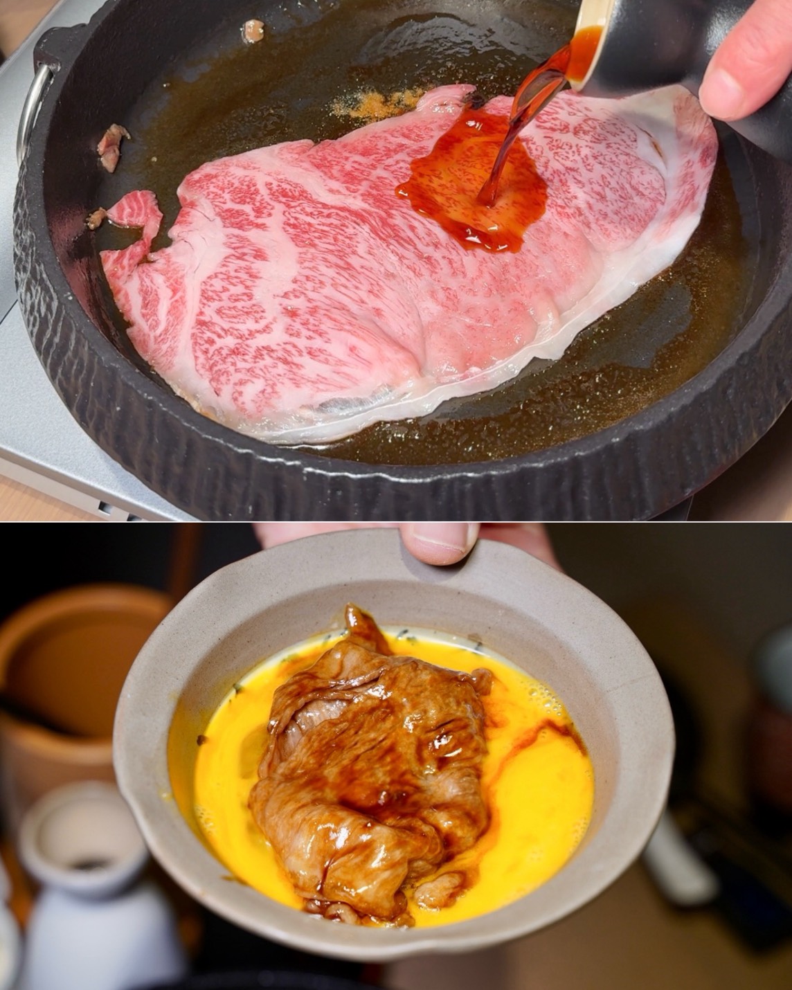 這片「日本和牛肋眼」比我的臉還大!油花美到不行,是用關西壽喜燒的方式料理,先在鐵鍋抹牛油,撒上三盆糖、海藻糖混合的糖粉,接著入牛肉、淋壽喜燒醬汁,吱吱作響超誘人。