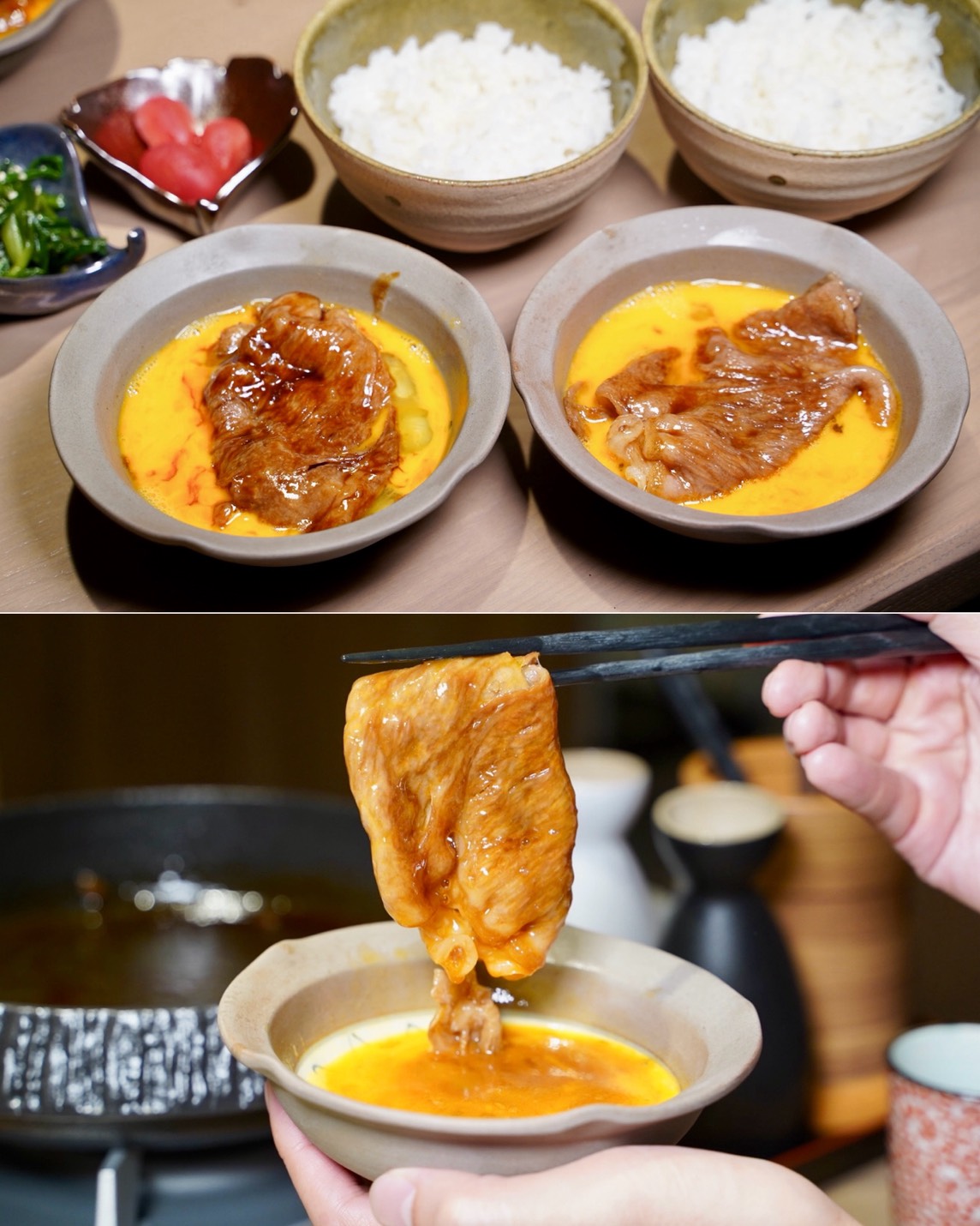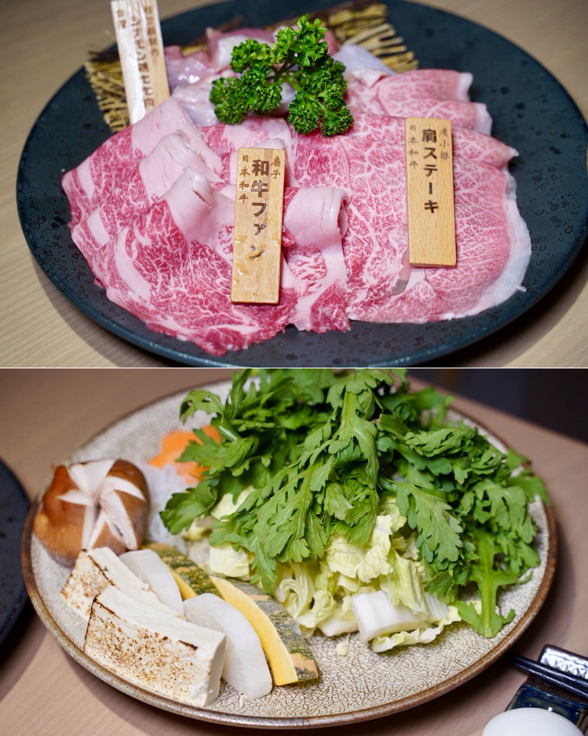 壽喜燒肉品有日本和牛肋眼、日和板腱京水菜、日本和牛肩卷以及桂丁雞腿肉,前兩個會用關西壽喜燒方式烹調,後兩個則是以關東壽喜燒呈現。