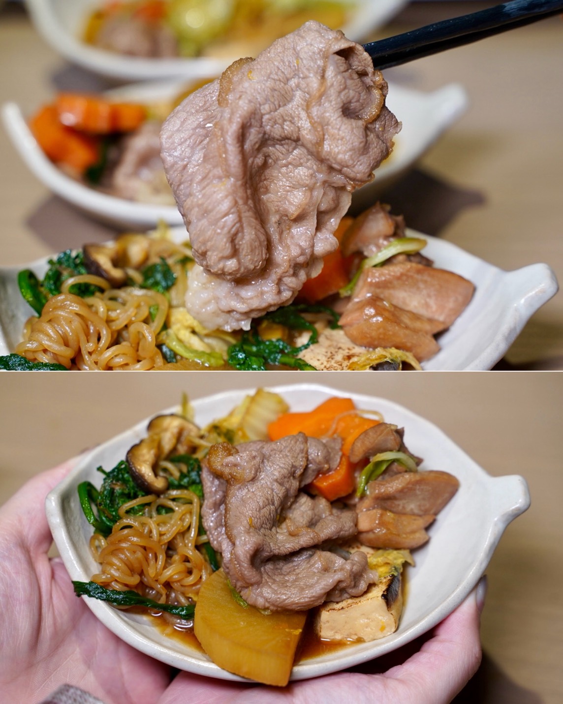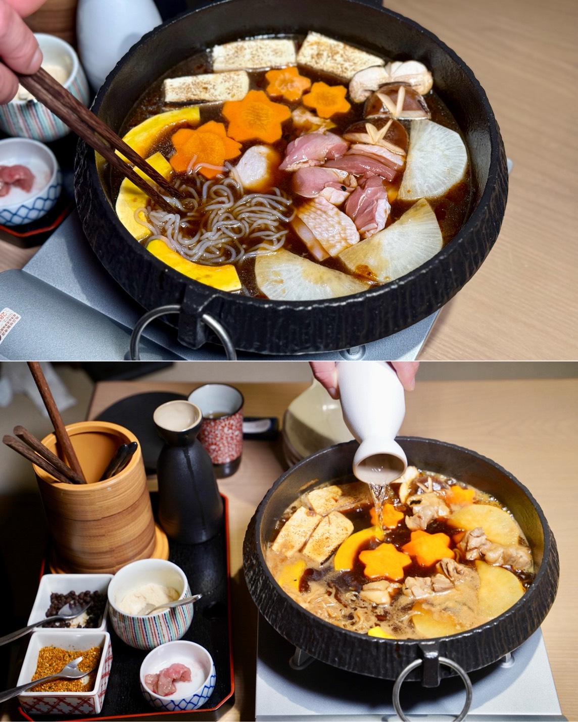 接著關東壽喜燒登場,用剛剛煎牛肉留下的精華,再丟進綜合菜盤、桂丁雞腿肉跟壽喜燒醬汁一起煮到滾,香氣整個爆發~