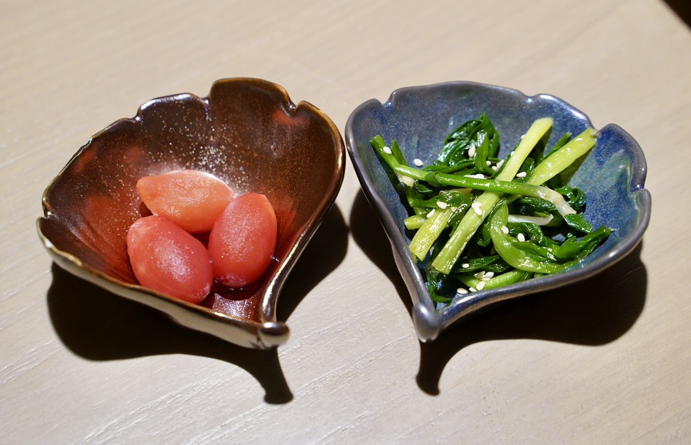 入座後先來杯麥茶暖暖胃,喝不夠都能無限續。開胃小菜給了「椒麻青檸杏鮑菇」跟「松露鹽漬白菜」,都做得很精緻。私心最愛松露鹽漬白菜,松露香氣濃郁、白菜爽脆,小菜每人可續一次。