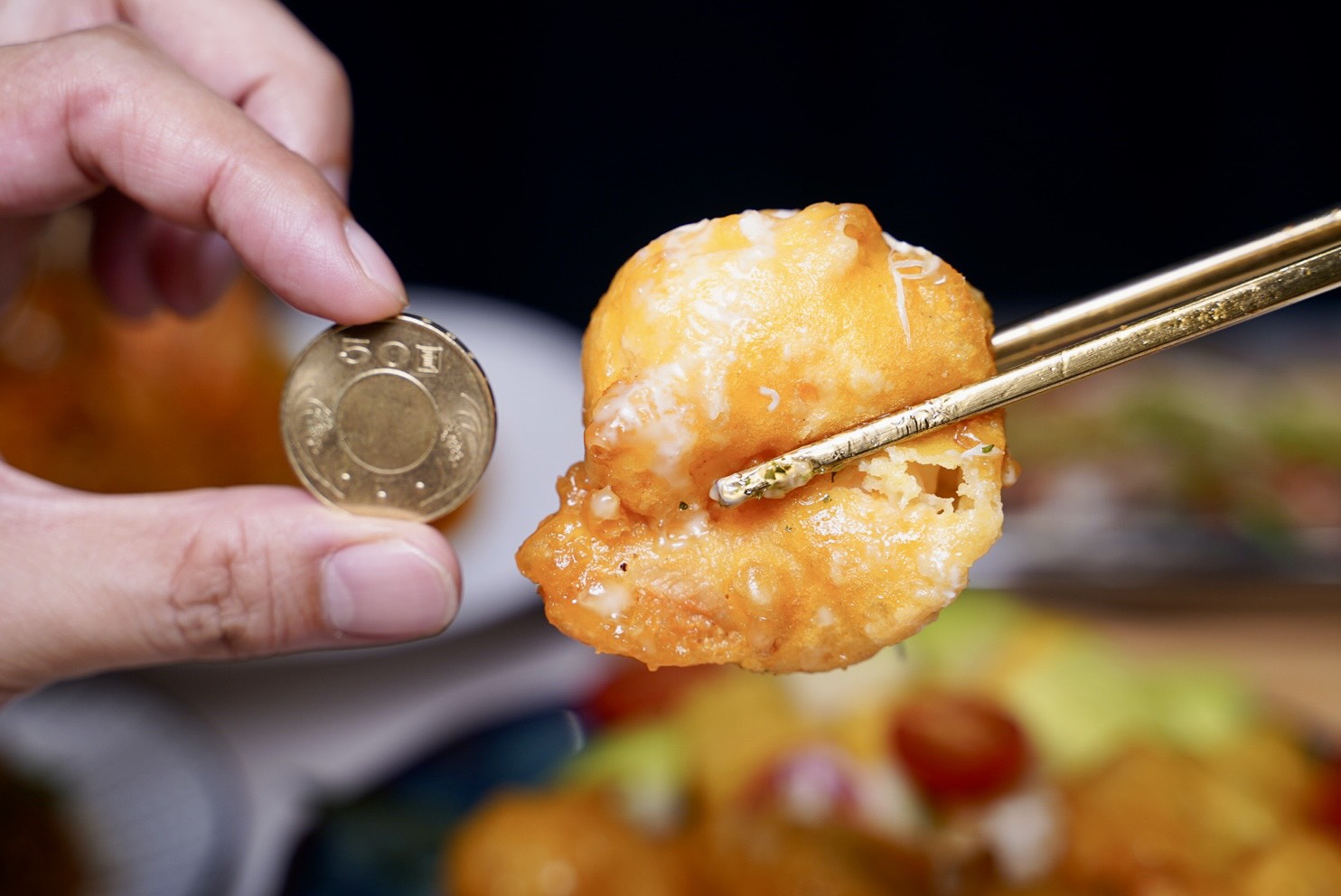 「鳳梨蝦球水果沙拉」這草蝦體型不說還以為是小龍蝦,比50元硬幣還大很多,麵衣厚度剛剛好,蝦仁咬下去非常脆彈,醬料是用優格醬代替美乃滋,一旁還有用梅子粉醃漬過的新鮮水果,整道菜清爽到不行,很適合夏日來上一盤。