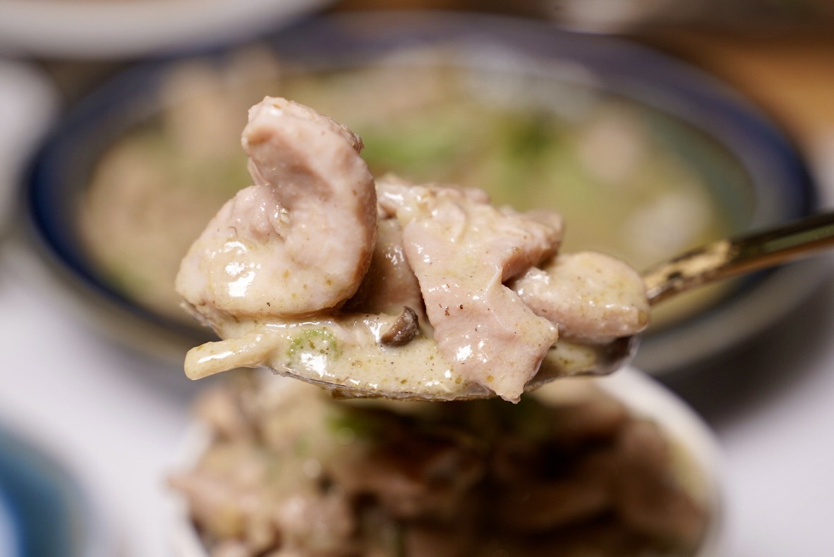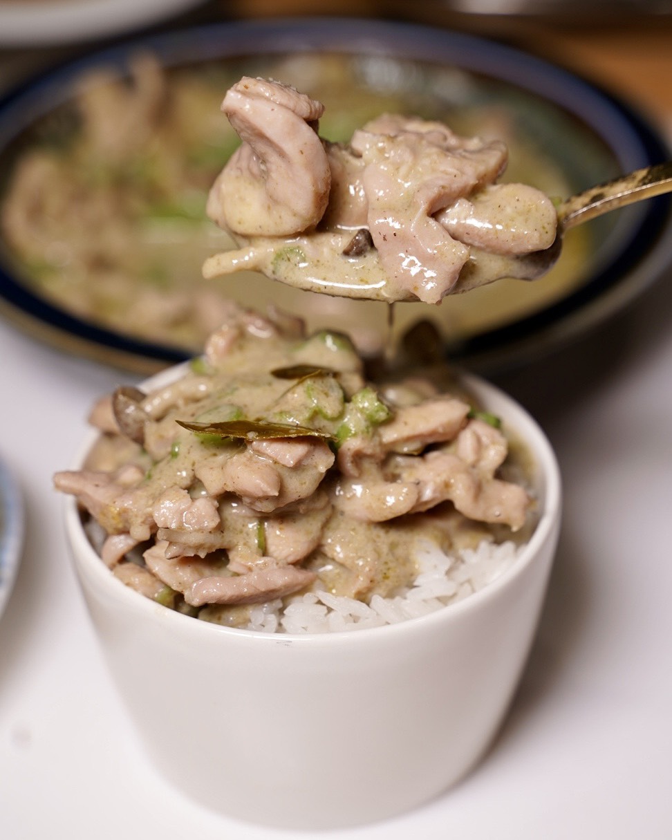 椰香濃郁到不行的「綠咖哩椰汁雞」也絕對是必點!去骨雞肉給得超大方,還有脆脆的豆子增添口感,整碗椰奶香氣超迷人,融合檸檬葉、香茅等南洋香料,微微辣度超開胃,裝一勺可以扒一碗飯,推爆!