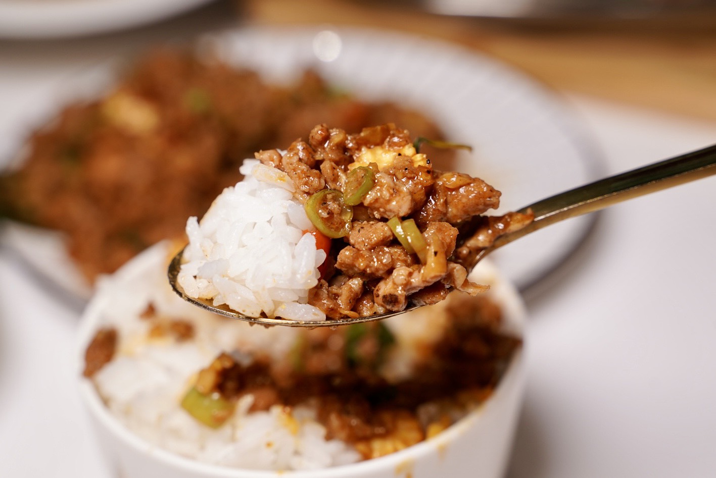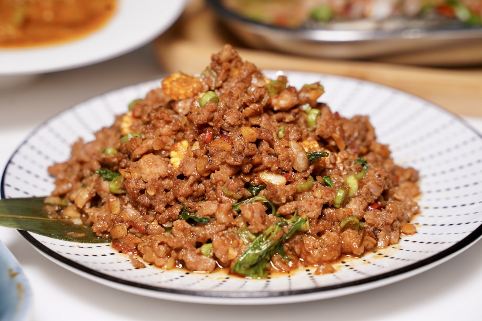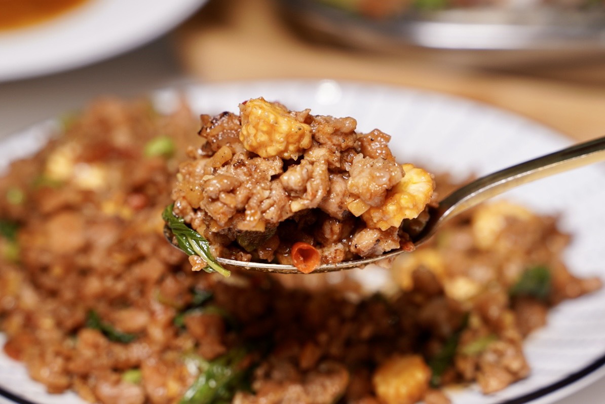 「辣炒打拋豬」打拋葉香氣混著蒜香、魚露的鹹鮮味以及檸檬酸香,光聞味道就讓人口水直流,每一口都能吃到鮮甜彈牙的豬絞肉,還有脆口的玉米筍,口感層次超豐富,也超級下飯!