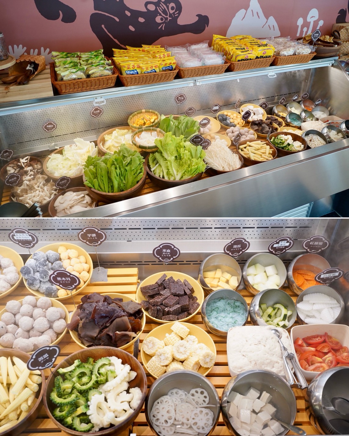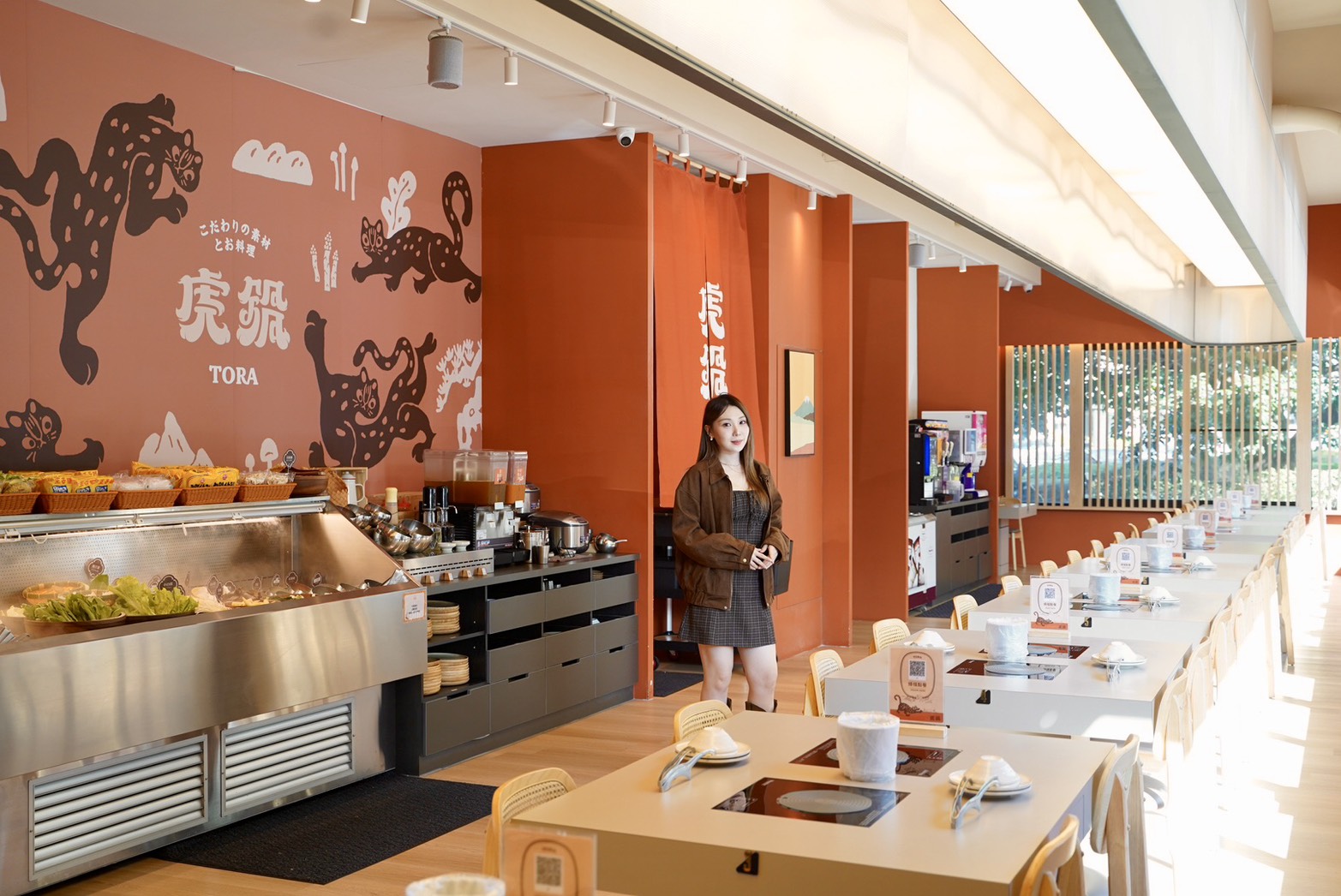 店內更是不得了,木質調結合大地色系,加上大片落地窗,空間寬敞明亮,整體氛圍暖到不行,店LOGO的圖案是苗栗特有的石虎,整個很有設計感。內用座位以四人座位為主,並以一人一鍋方式供應,自助吧動線流暢不擁擠,用餐起來非常舒適。